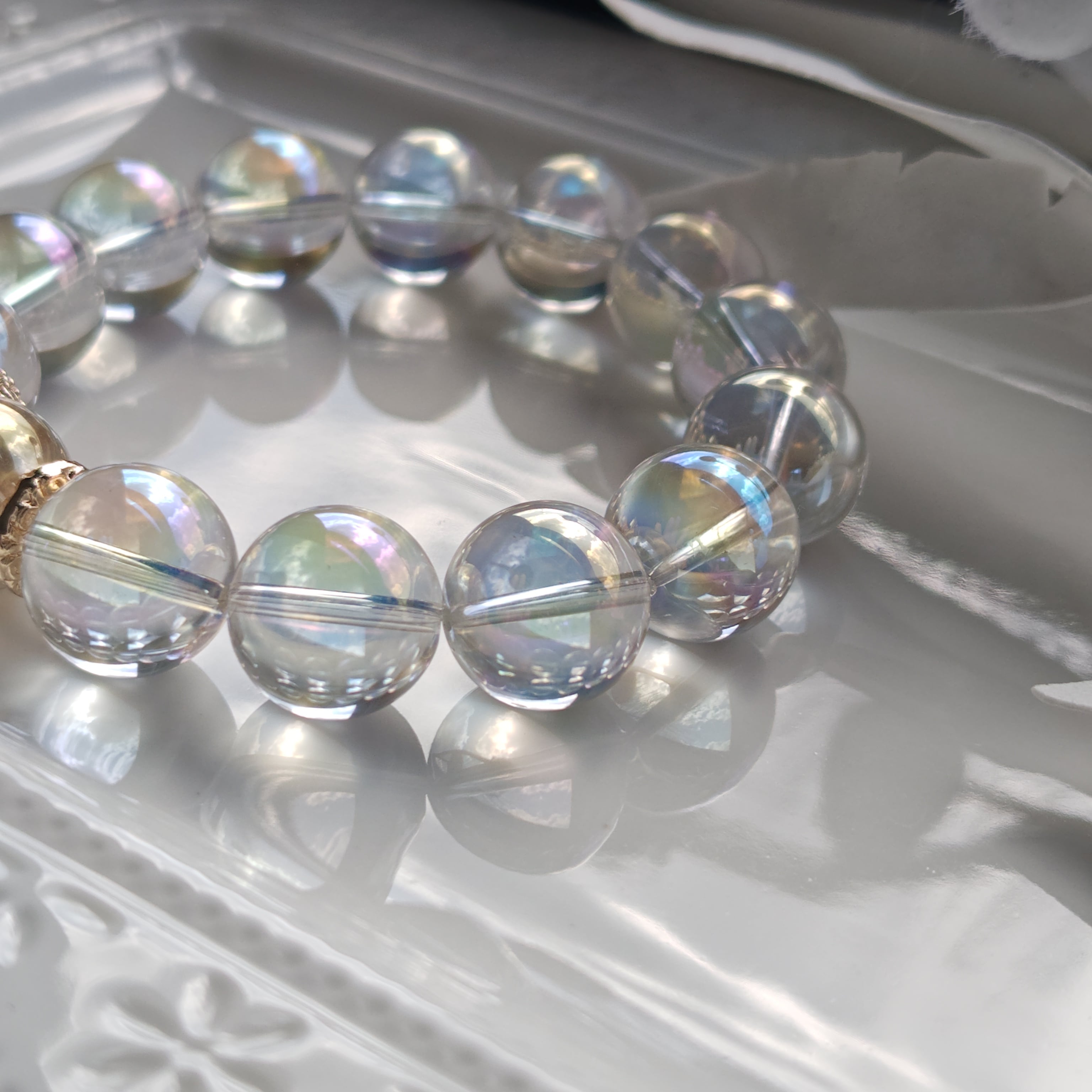 水晶の表面にオーロラ調のコーティングを施した石さんです。 表面の輝きはチタン蒸着によるもので、シャボン玉のような光を放ちます。