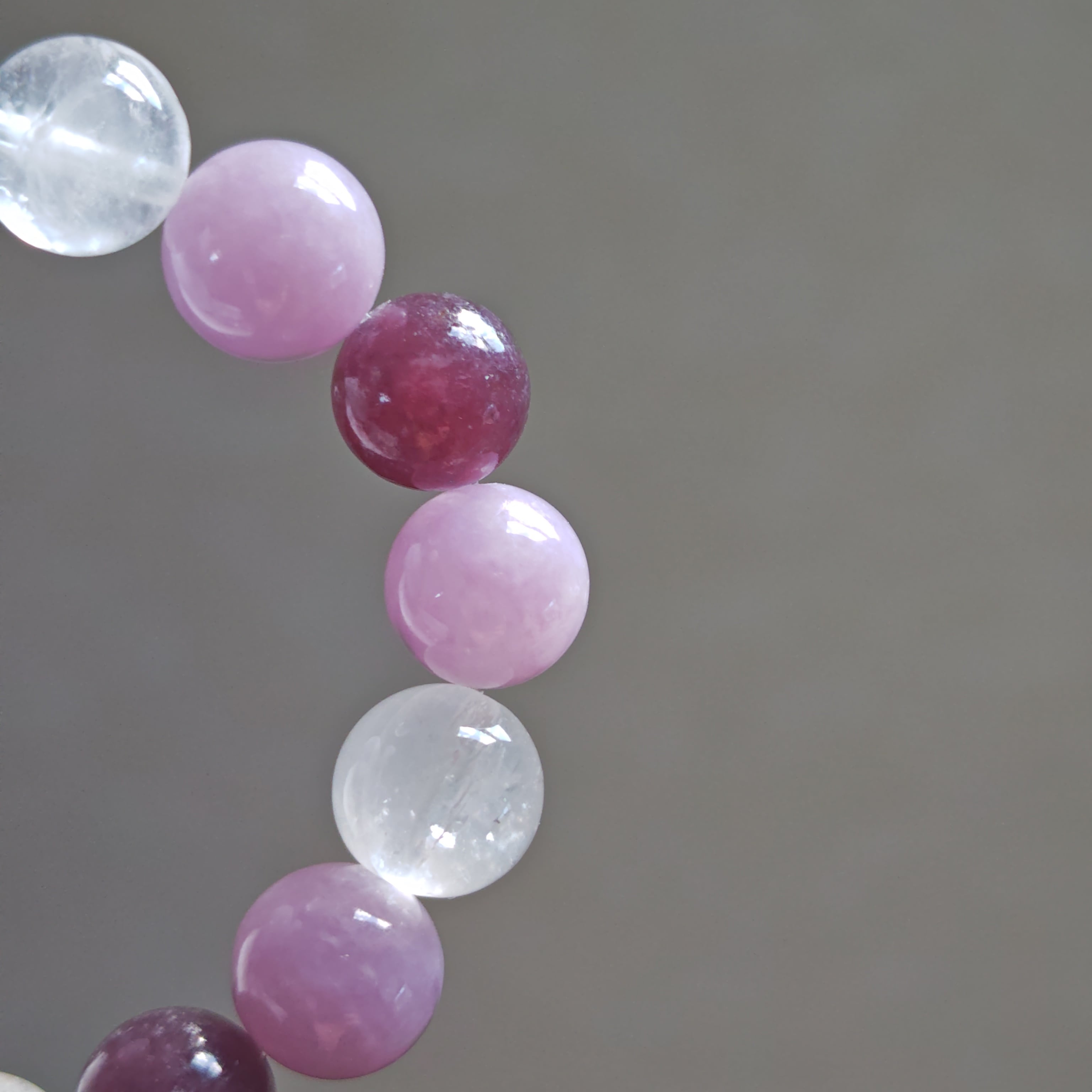 ピンクラベンダーカラーのレピドライトと濃いプラムカラーのレピドライトとヒマラヤ産カンチェンジュンガ水晶でスッキリ仕上げました♪