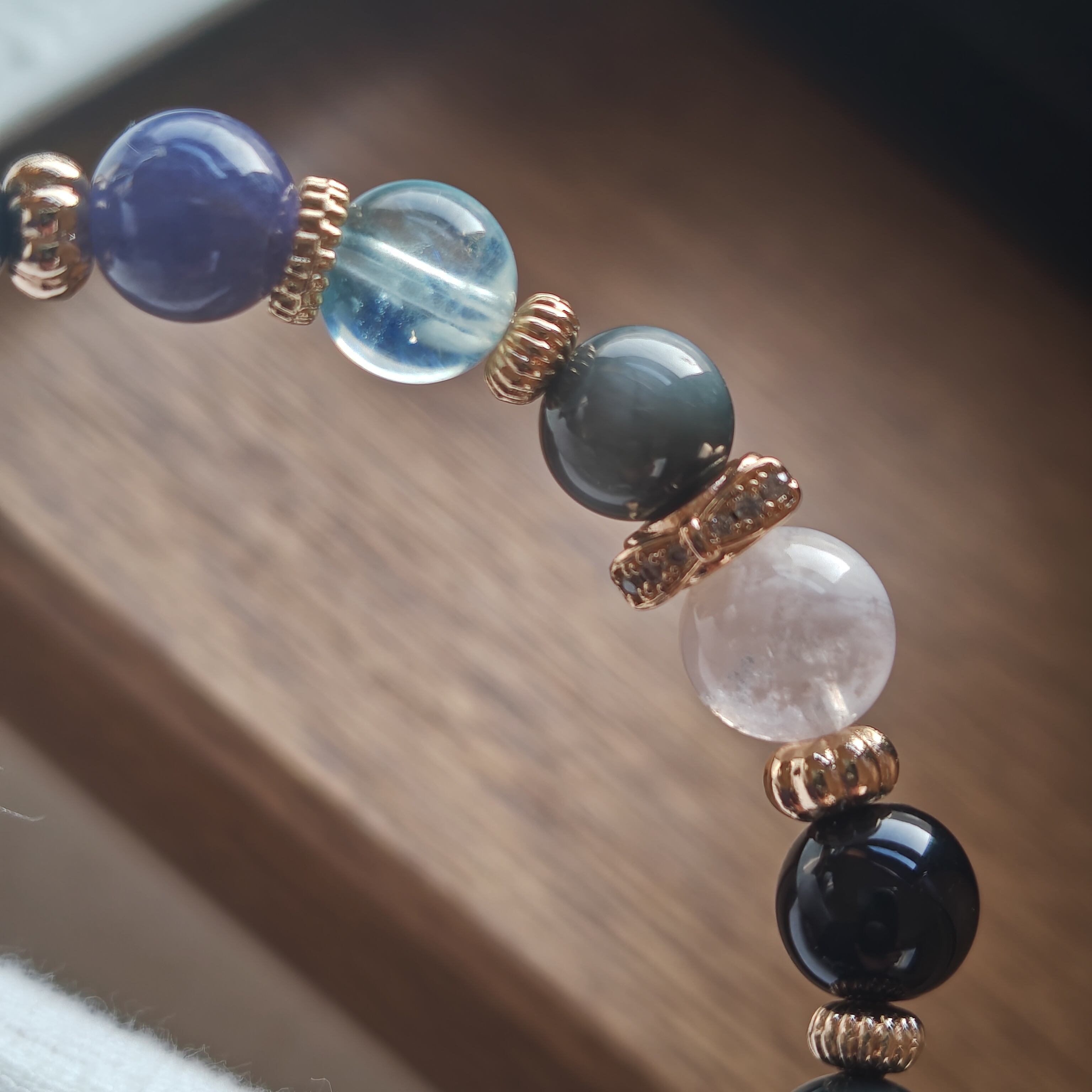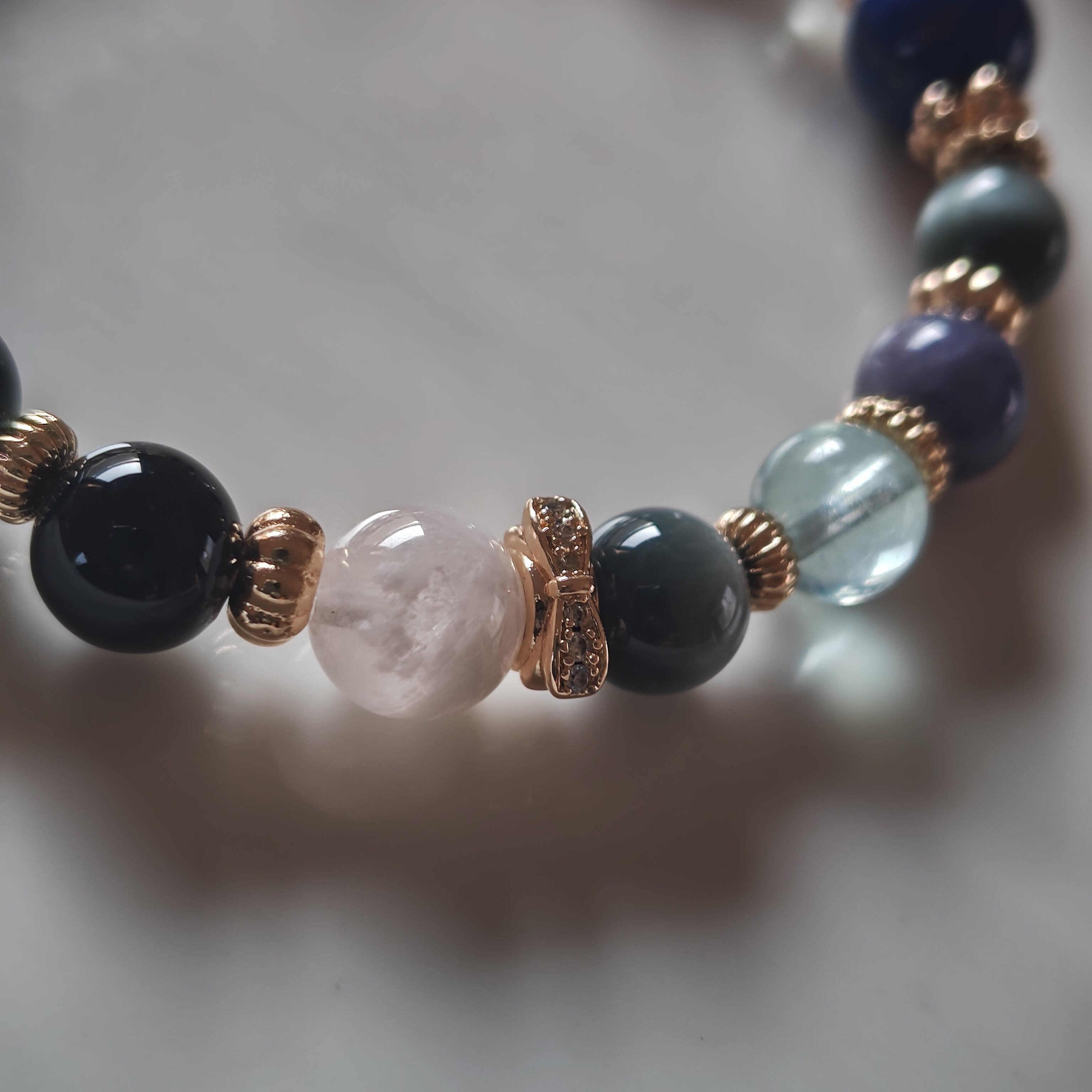 こちらは、ブルータイガーアイとラピスラズリ、イーグルアイをメインに、神秘的なブラック北投石と癒しのセリサイトを絶妙に組み合わせています。これらの石の魅力を最大限に引き立てるデザインで、どんな装いにも合うスタイルに仕上げました♡