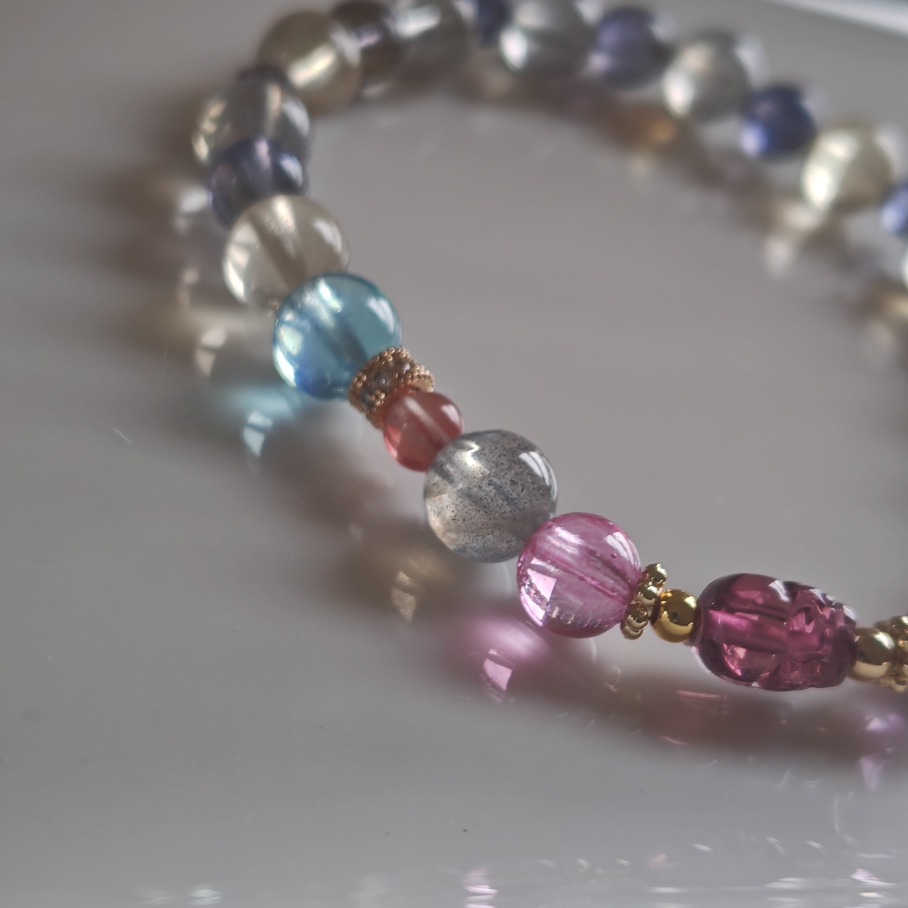 今回ルベライトトルマリンのちびちゃん貔貅を入荷しましたので、透明感のある細身な華奢ブレスを作製しました(^^)