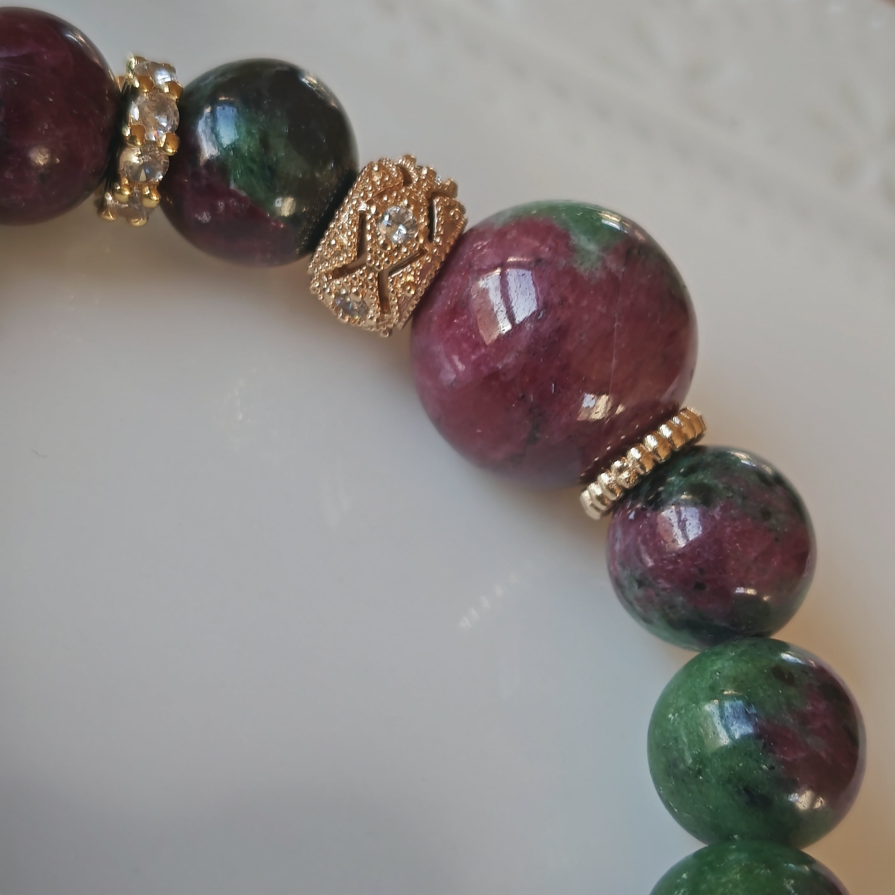 ルビゾイサイト(ルビーインゾイサイト)には、情熱と癒やしのバランスによる精神的な活性化、目標達成を後押しする実現力、そして未来を見通す洞察力などの効果があるとされています。ルビーの情熱的な力とゾイサイトの癒やしや直感力を併せ持ち、心身にポジティブな力を与えるとされています。