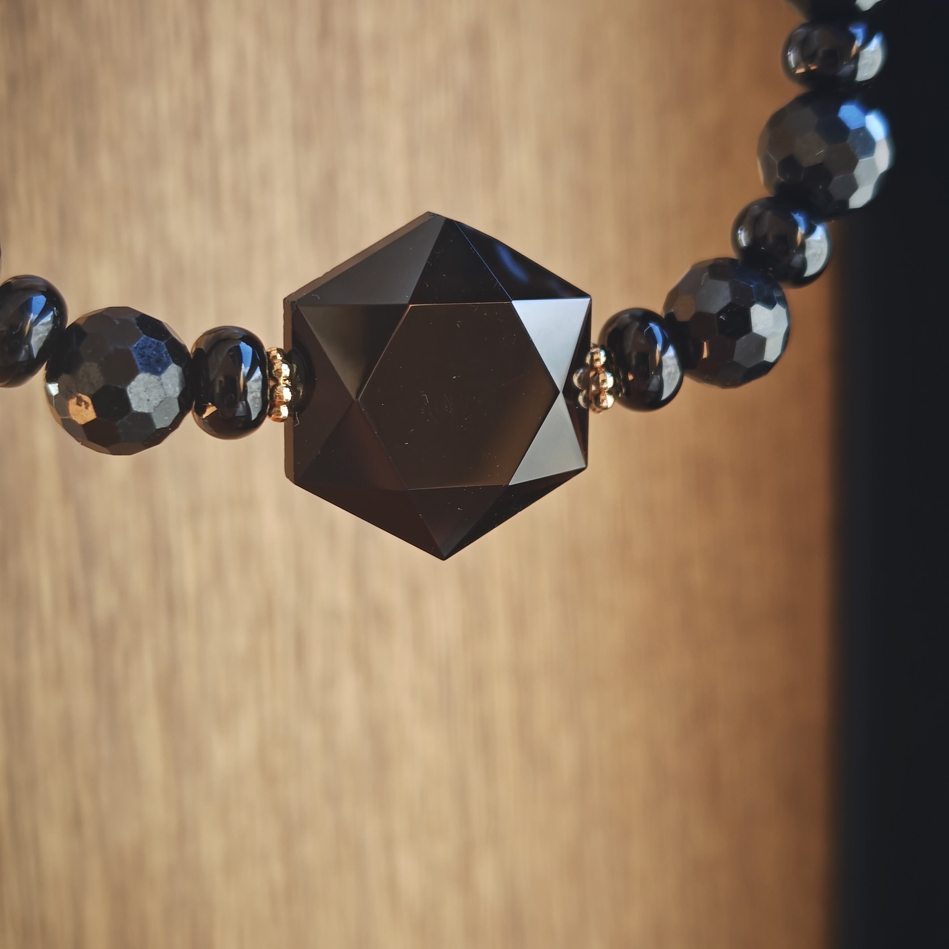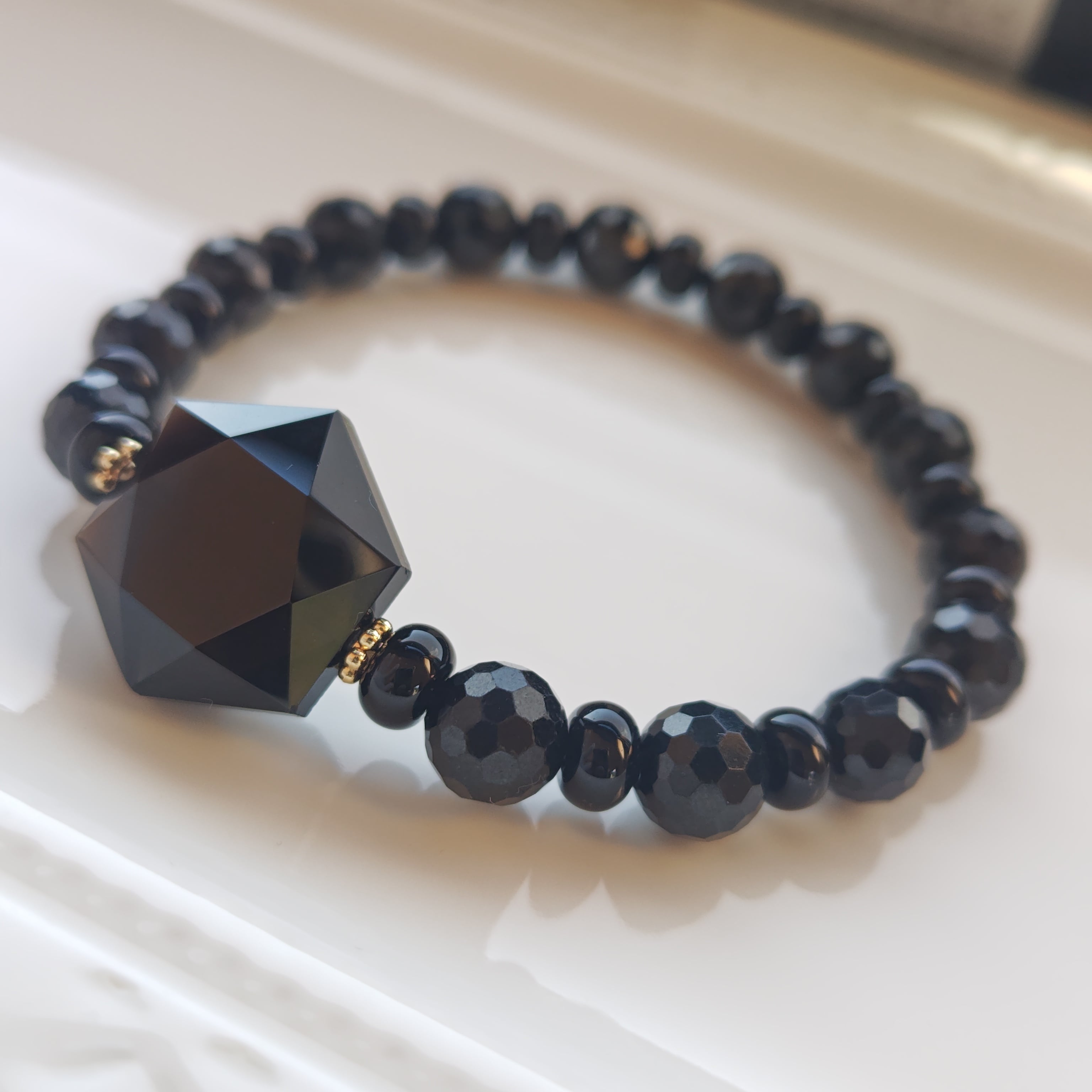最強の邪気払いモリオン六芒星と黒翡翠、黒瑪瑙ボタンで黒一色のお守りブレスレットになります。
