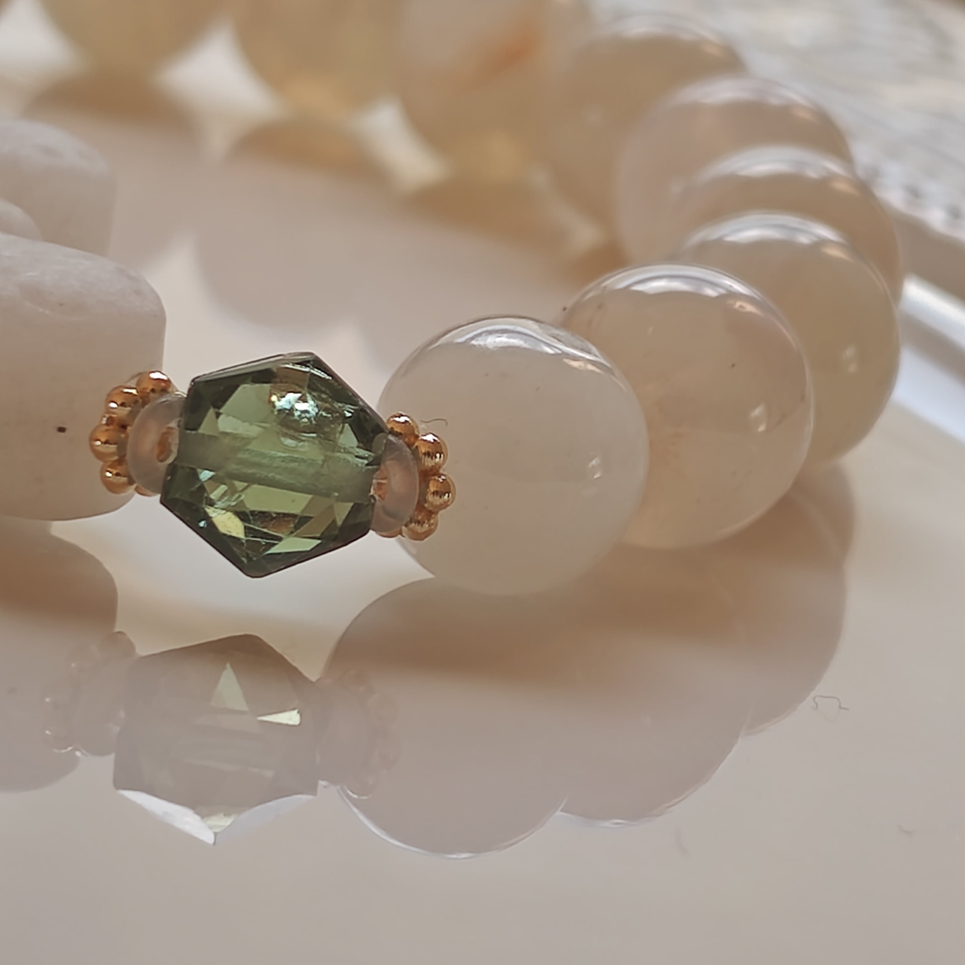 差し石にムーンストーンと白翡翠、そして宝石質グリーンアパタイト六芒星で華やかさを出しました♡