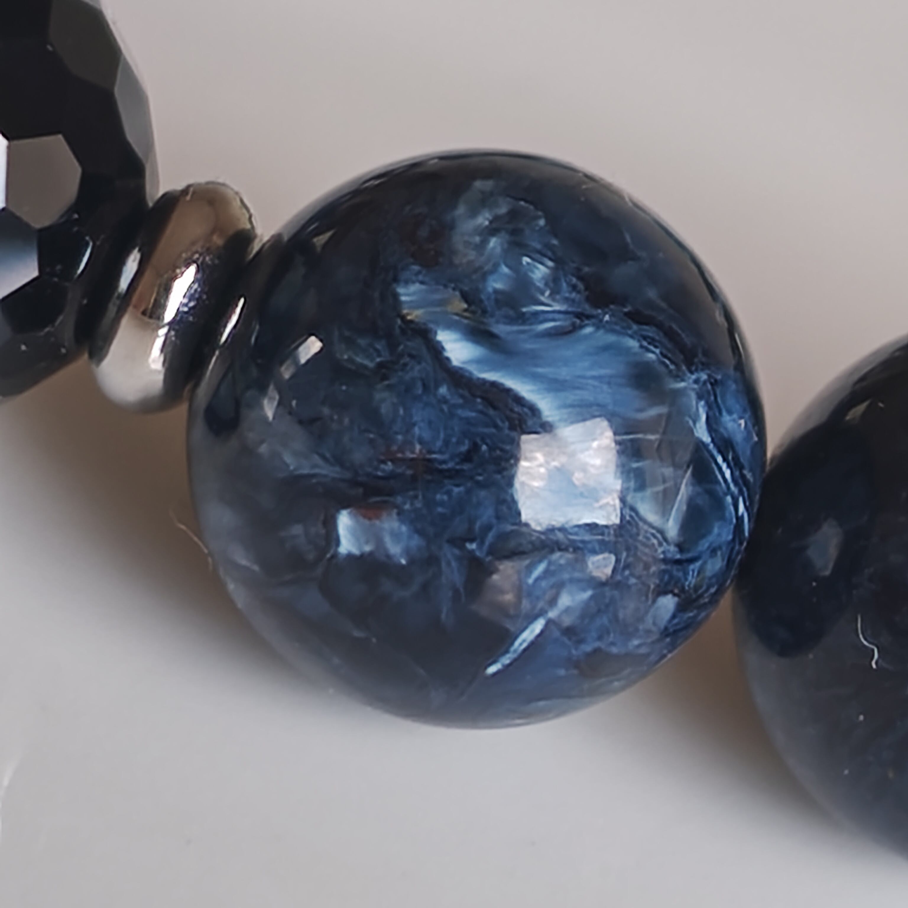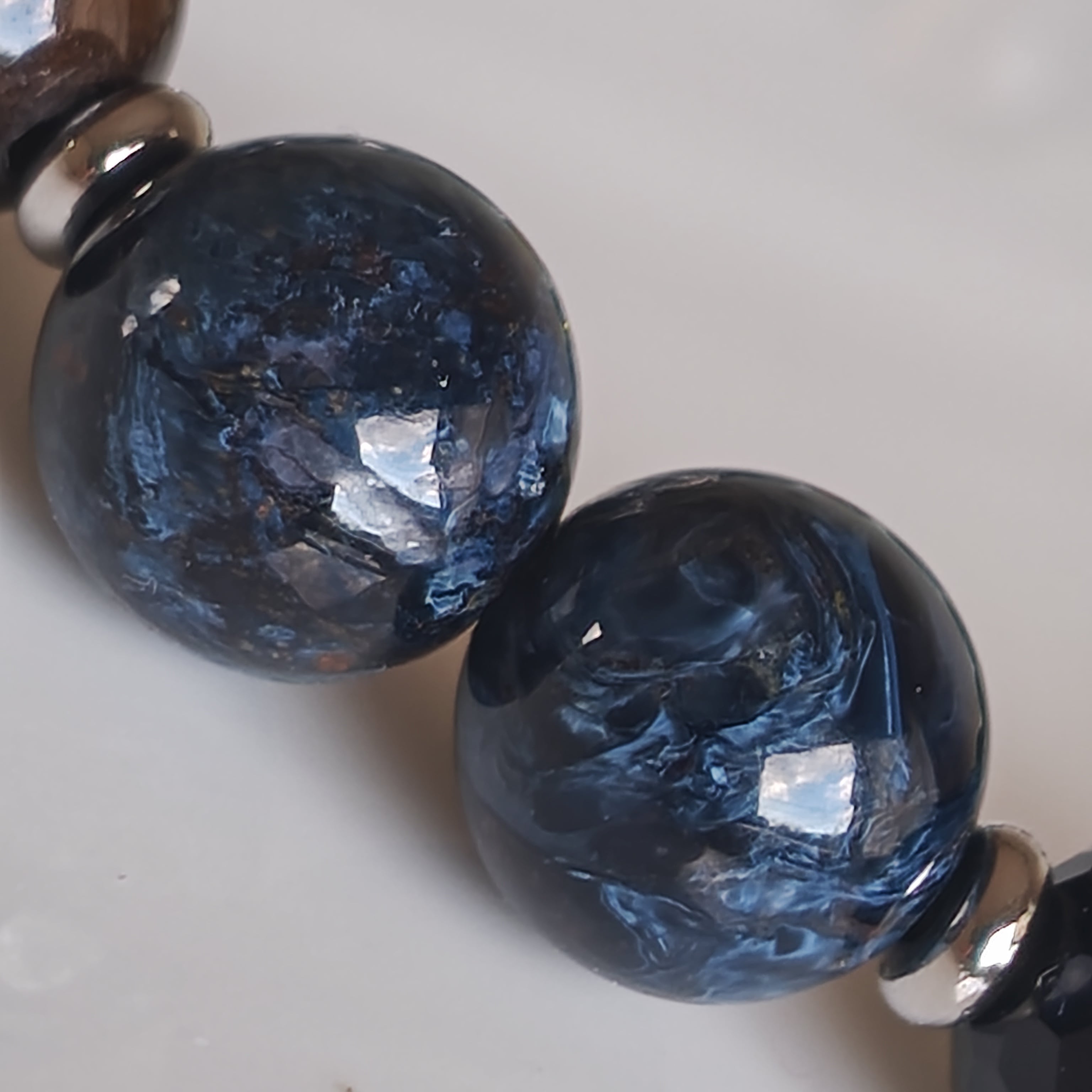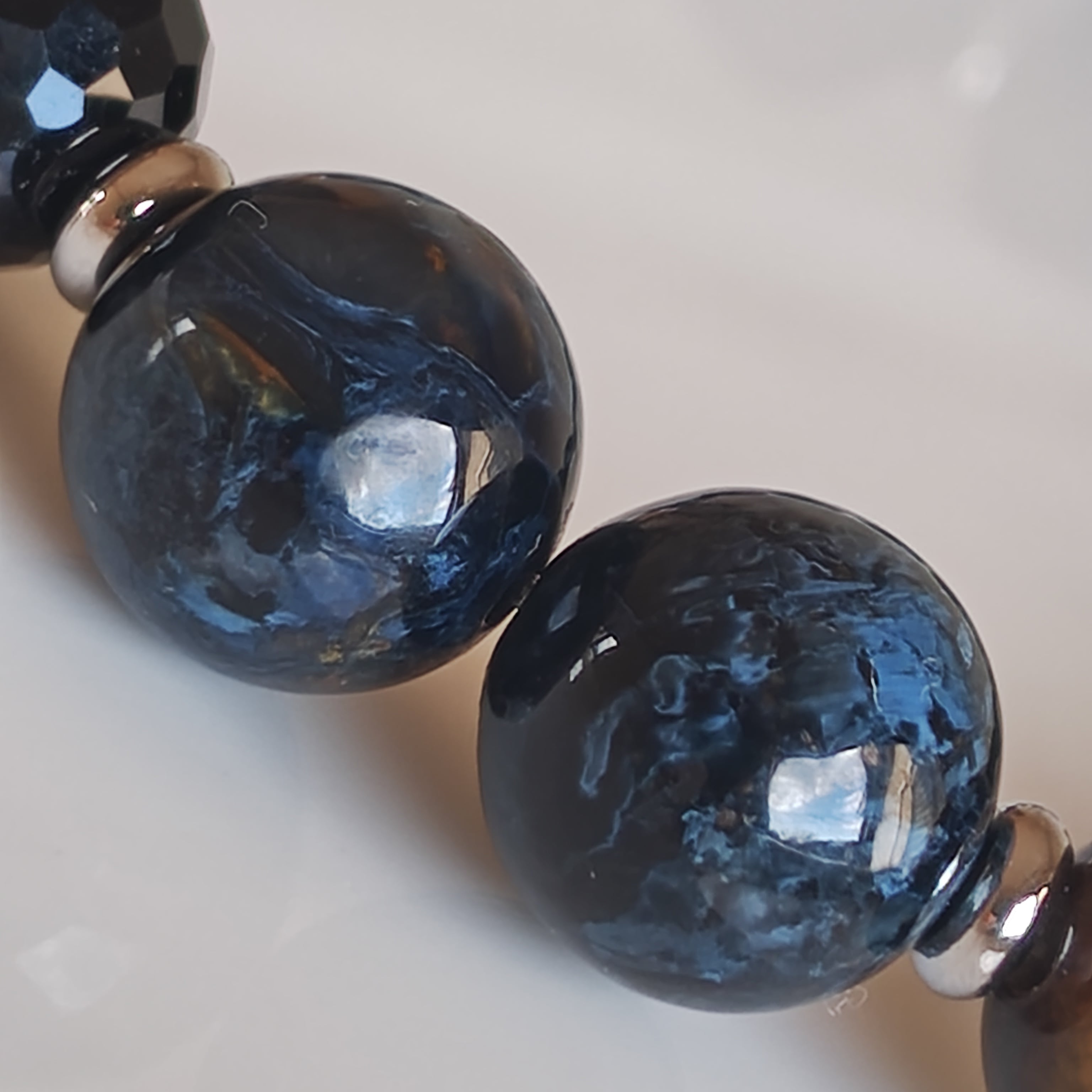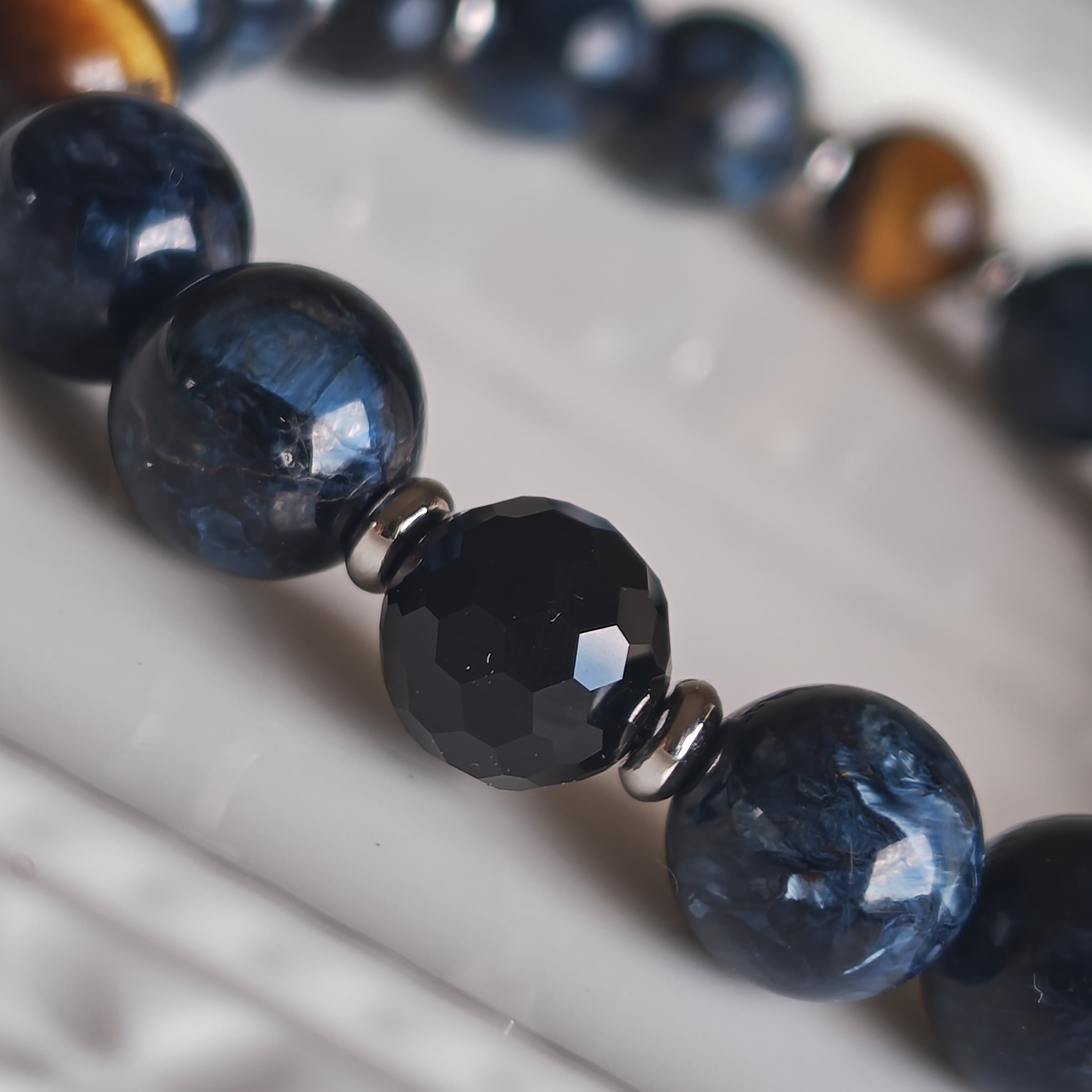 今回は高品質のブルーピーターサイトと宝石カットモリオン、そしてイエロータイガーアイでシックなブレスレットに仕上げました♪