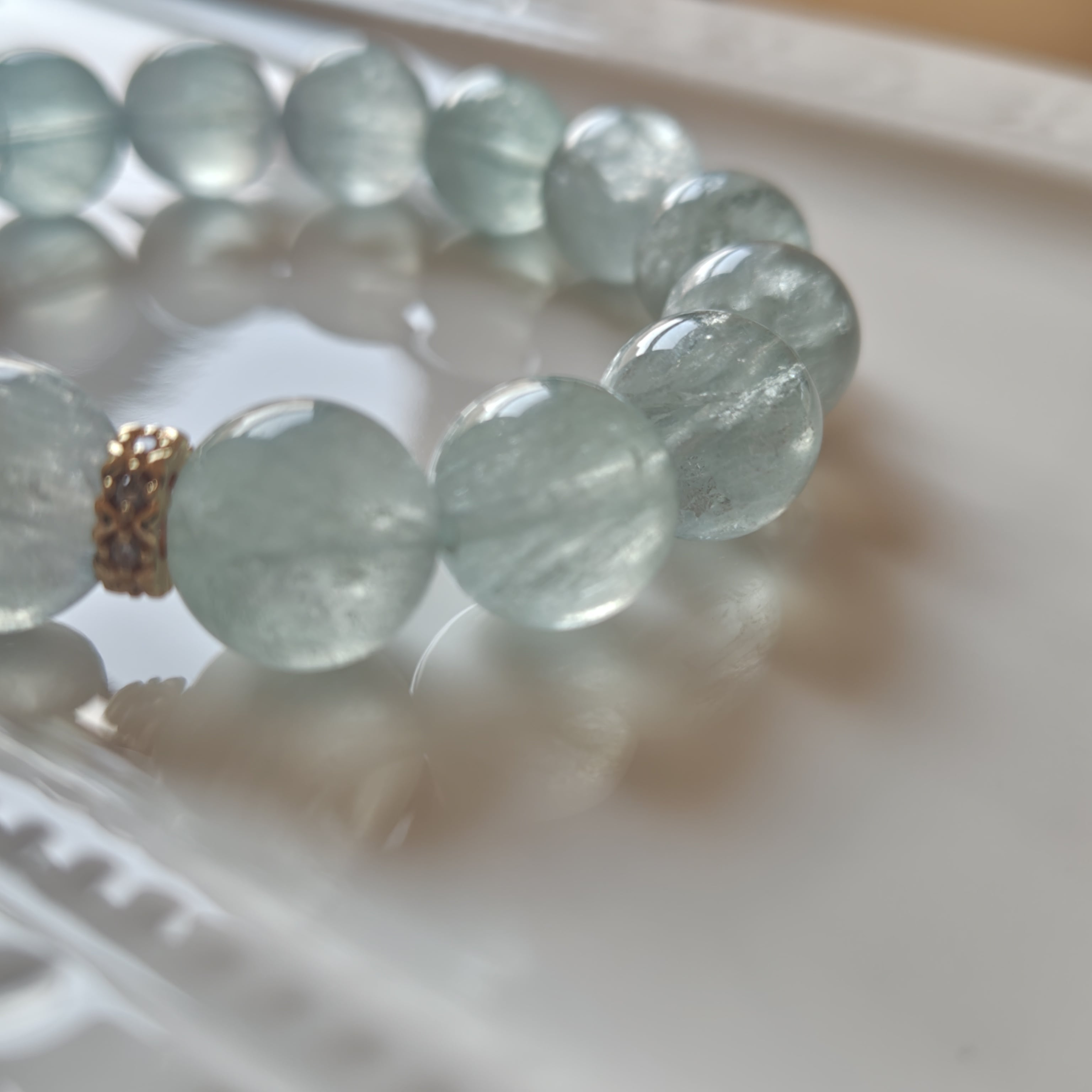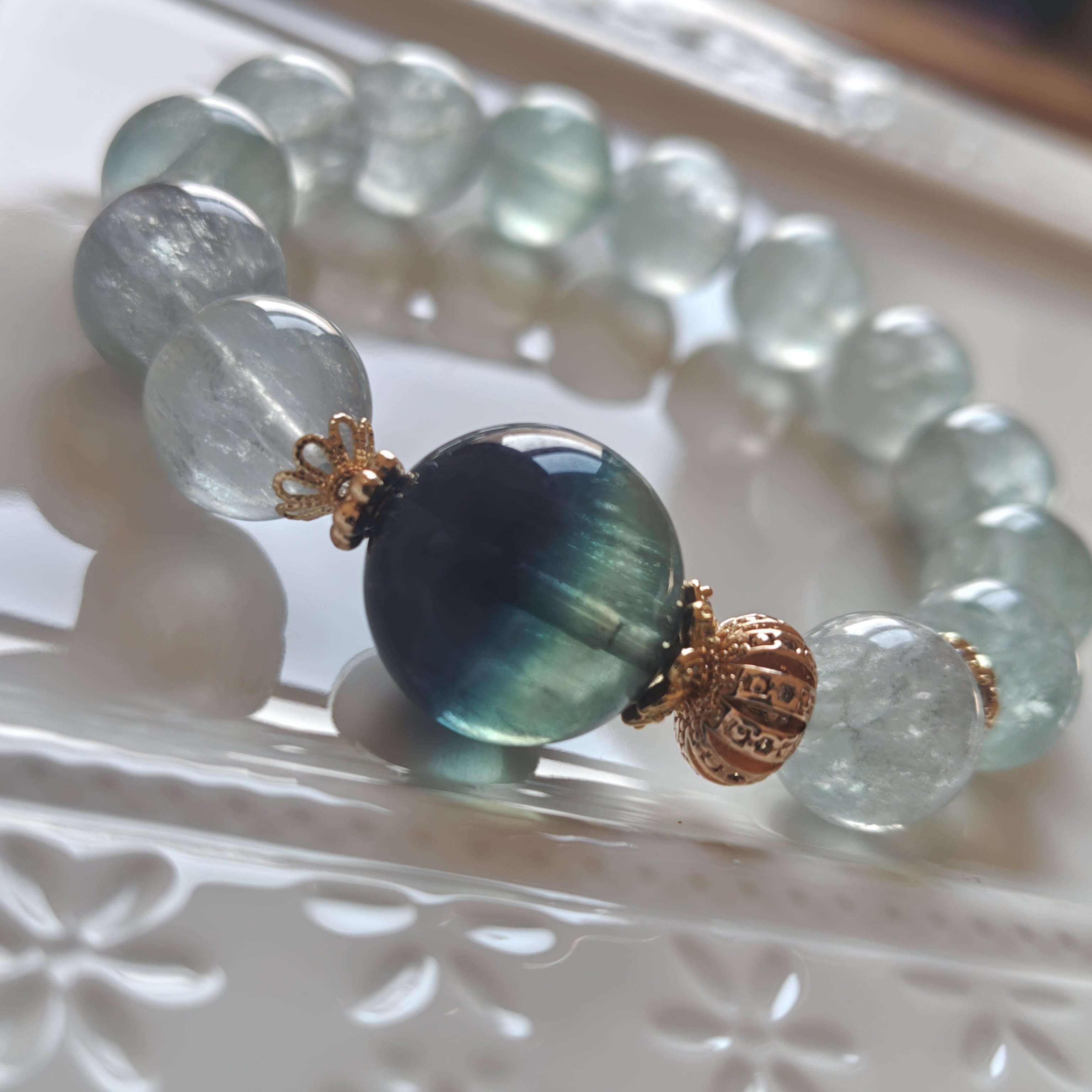 心に活力と落ち着きをもたらす、神秘的な色合いを持つグリーンフローライトをベースに圧巻の大玉高品質バイカラーブルーフローライトをトップに組んだブレスレットです♡