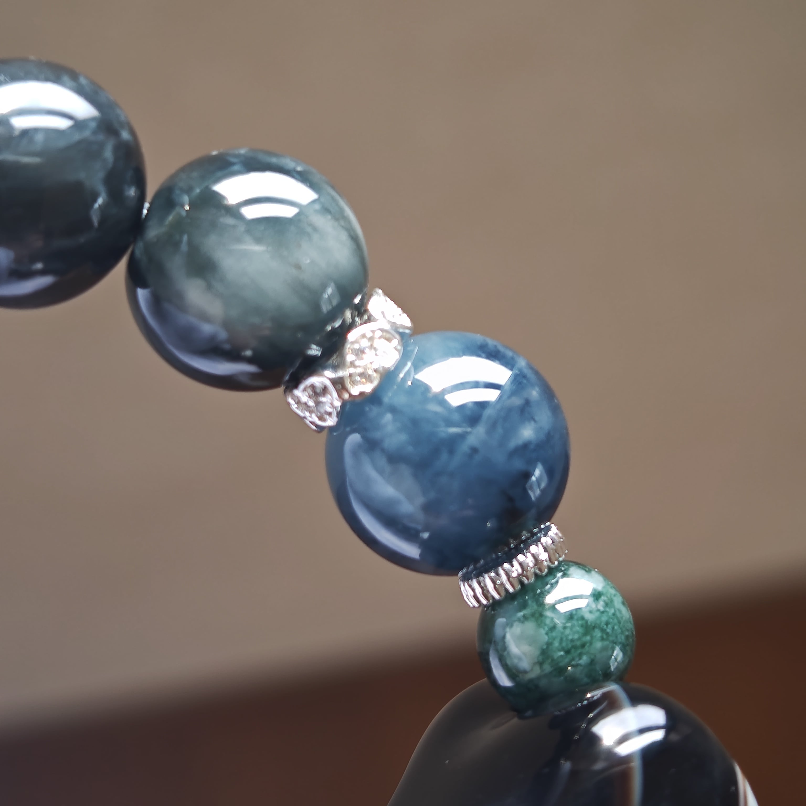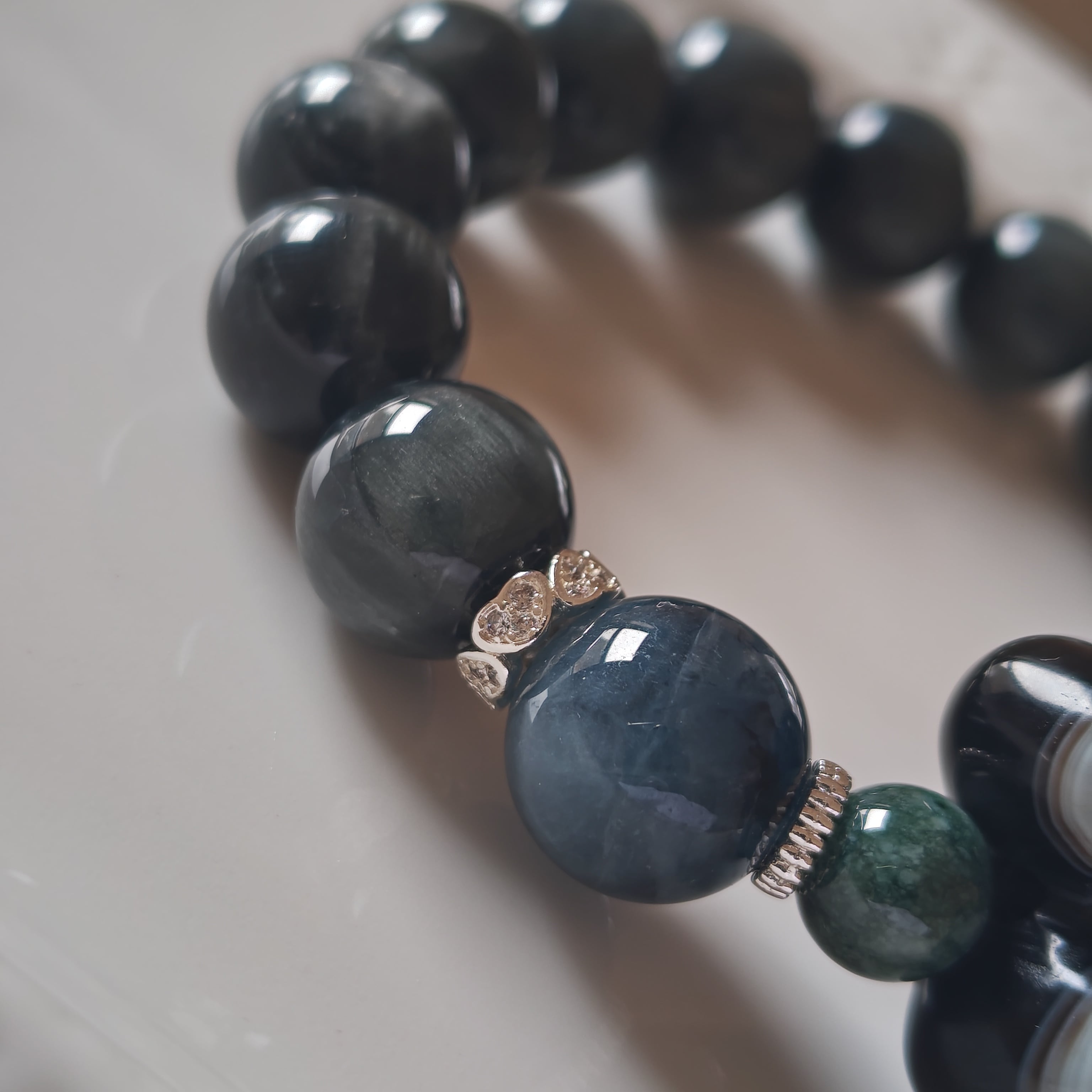 イーグルアイ、ブルーアンフィボール、グアテマラ産翡翠、モリオン、無処理天然ホワイトオニキスが絶妙に組み合わさったデザインで、持つ人の魅力を引き立てます!
