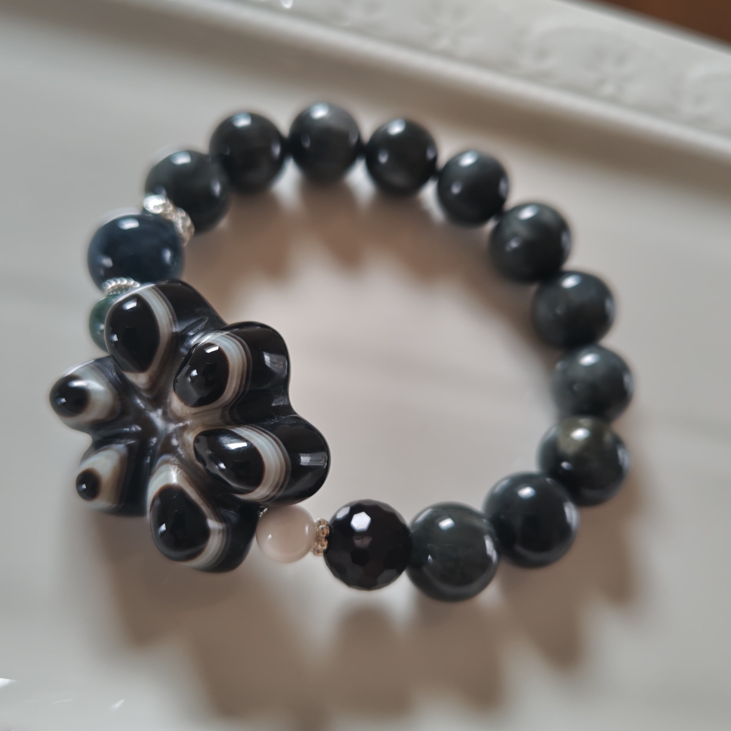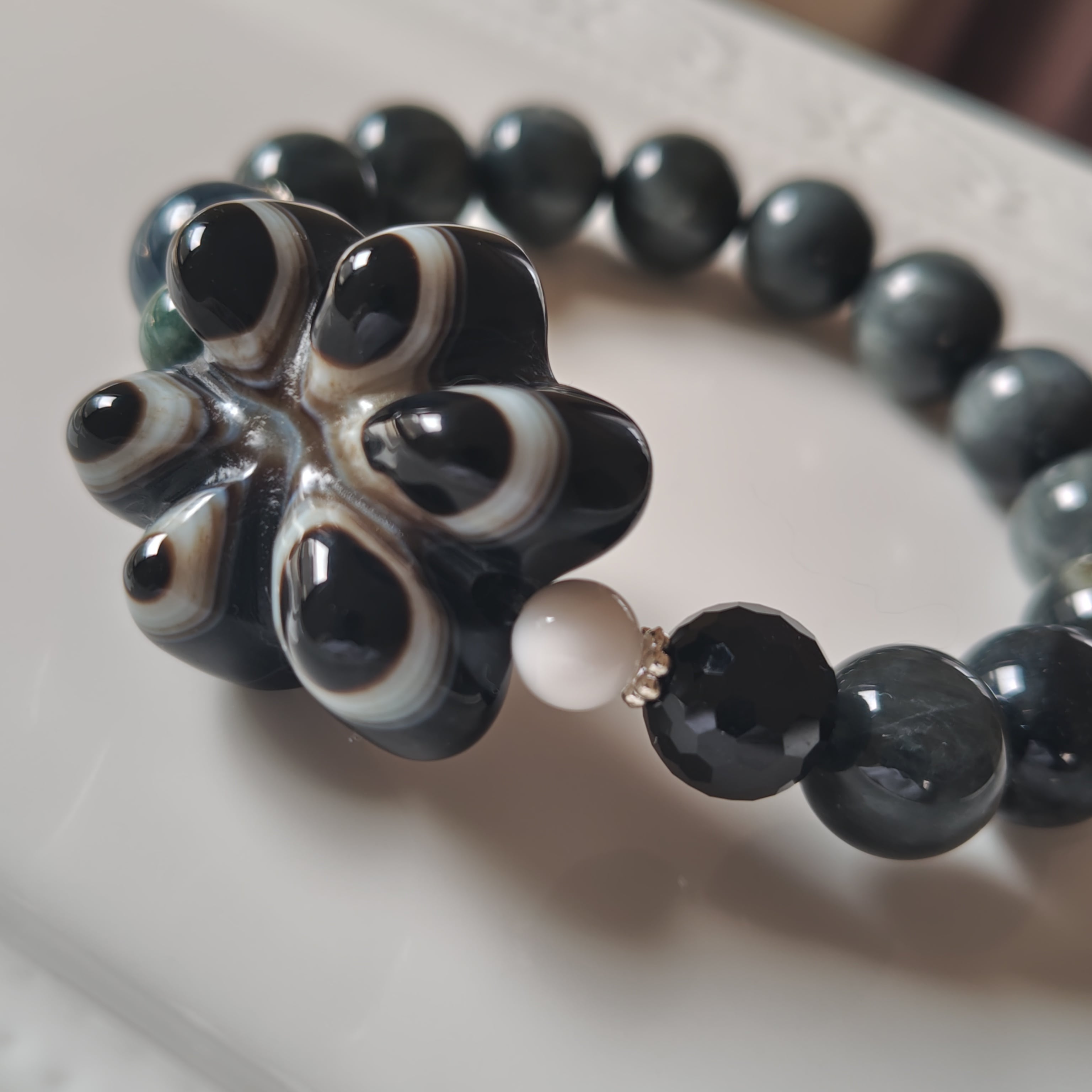 羊眼天珠、イーグルアイ×ブルーアンフィボール×グアテマラ産翡翠×モリオン×無処理天然ホワイトオニキス