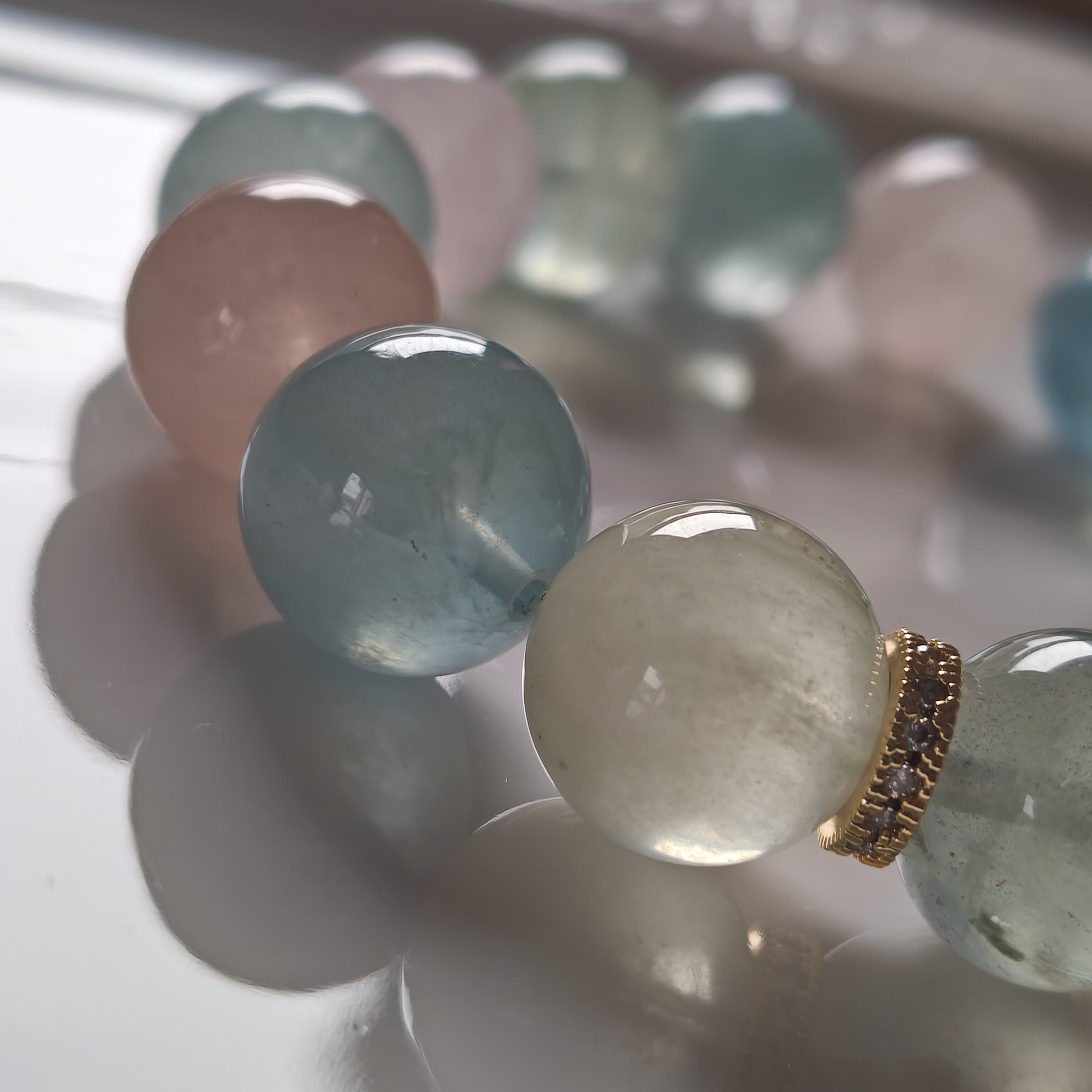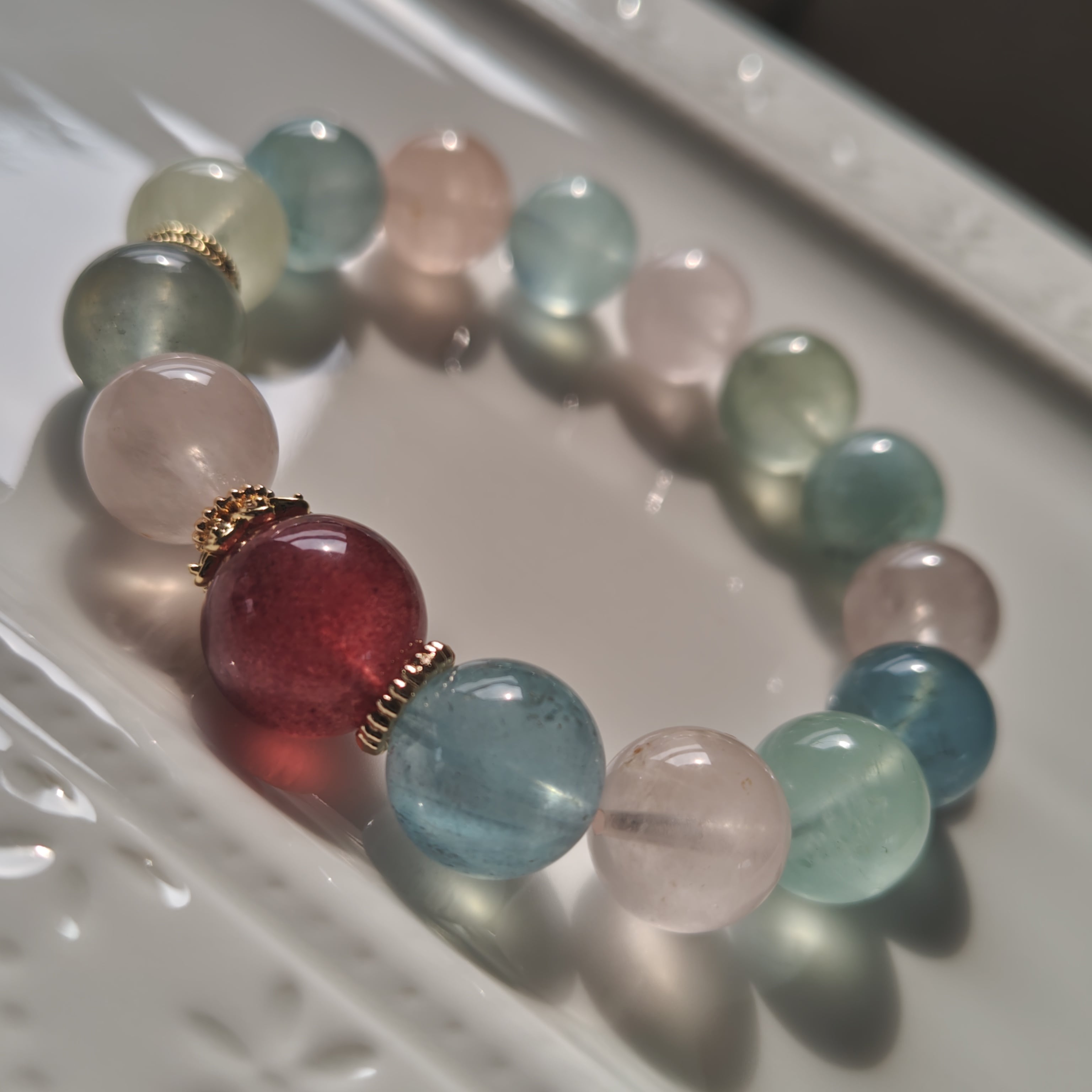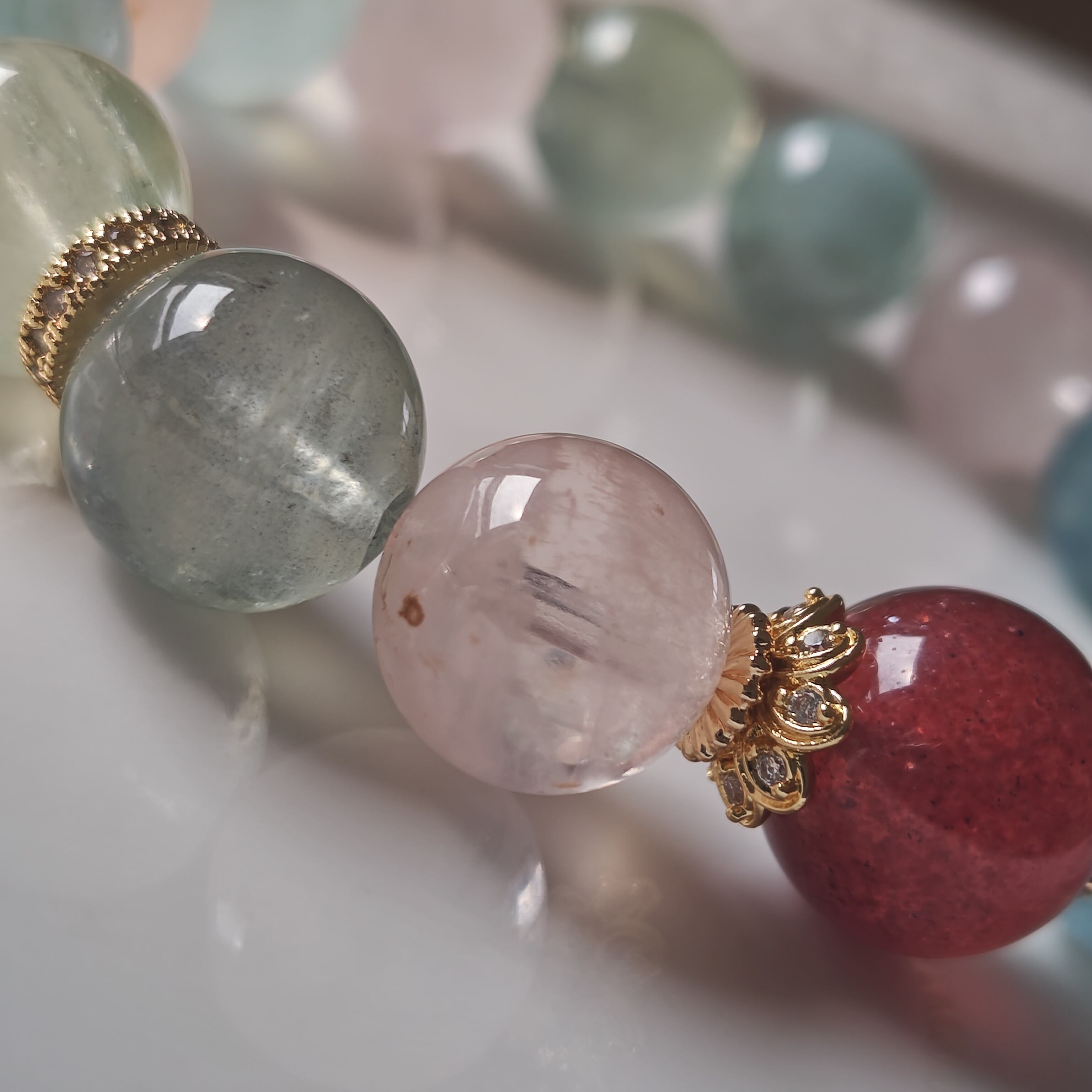 透け感のある美しいベリルの色彩と、ストロベリーマイカの優しい輝きが絶妙に調和し、身に着けることで一層の魅力を引き立てます!