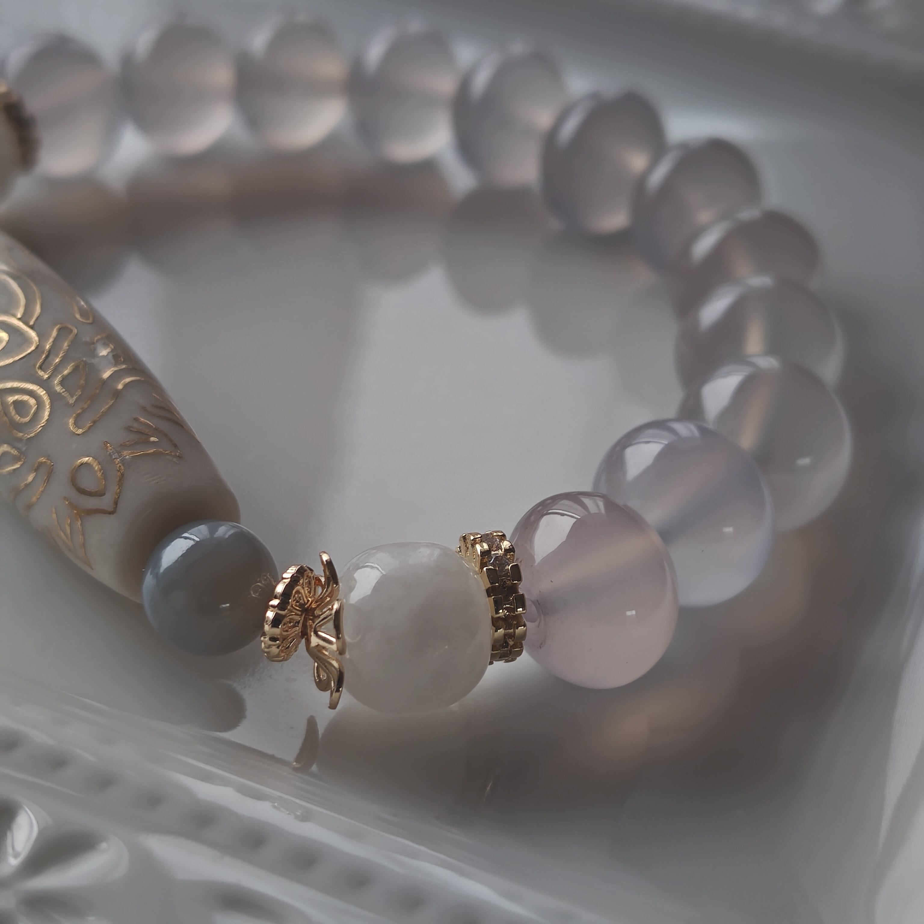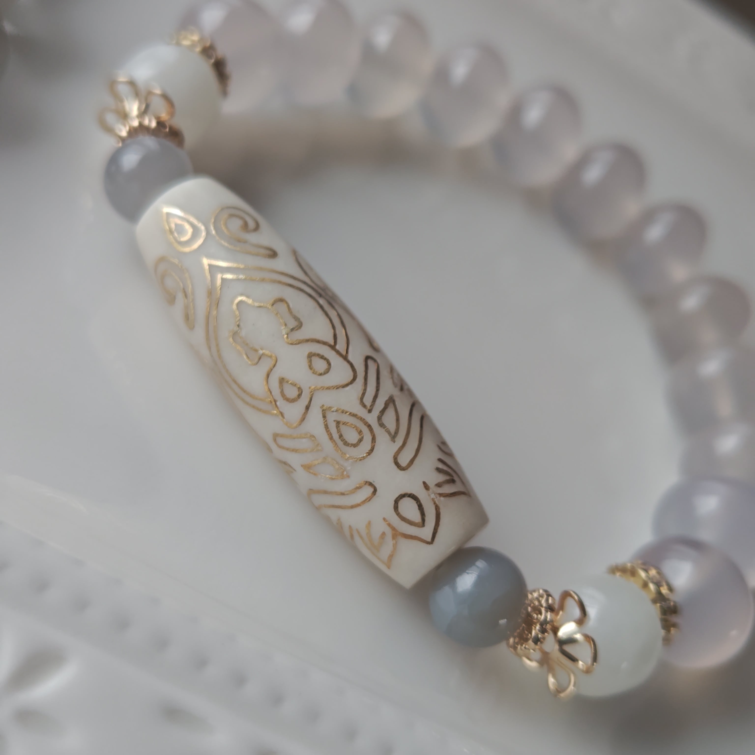 待ち望んだ真っ白の18Kコーティング双頭蓮観音天珠と非常に貴重な天然の高品質カルセドニーを贅沢に組み合わせた特別な一本をお作りしました♪