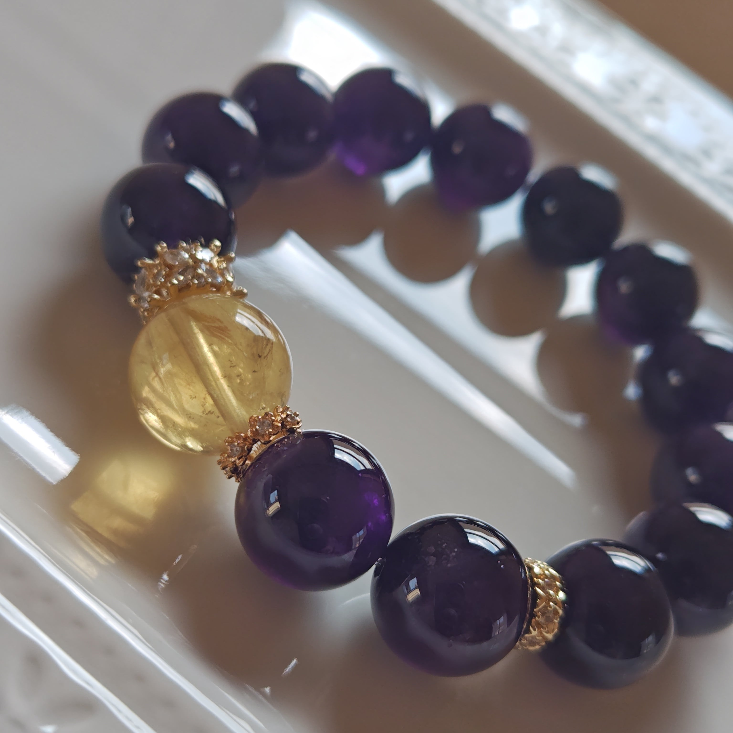 ウルグアイ産アメジストベースにイエローフローライトを一粒合わせた贅沢なブレスレットになります♪