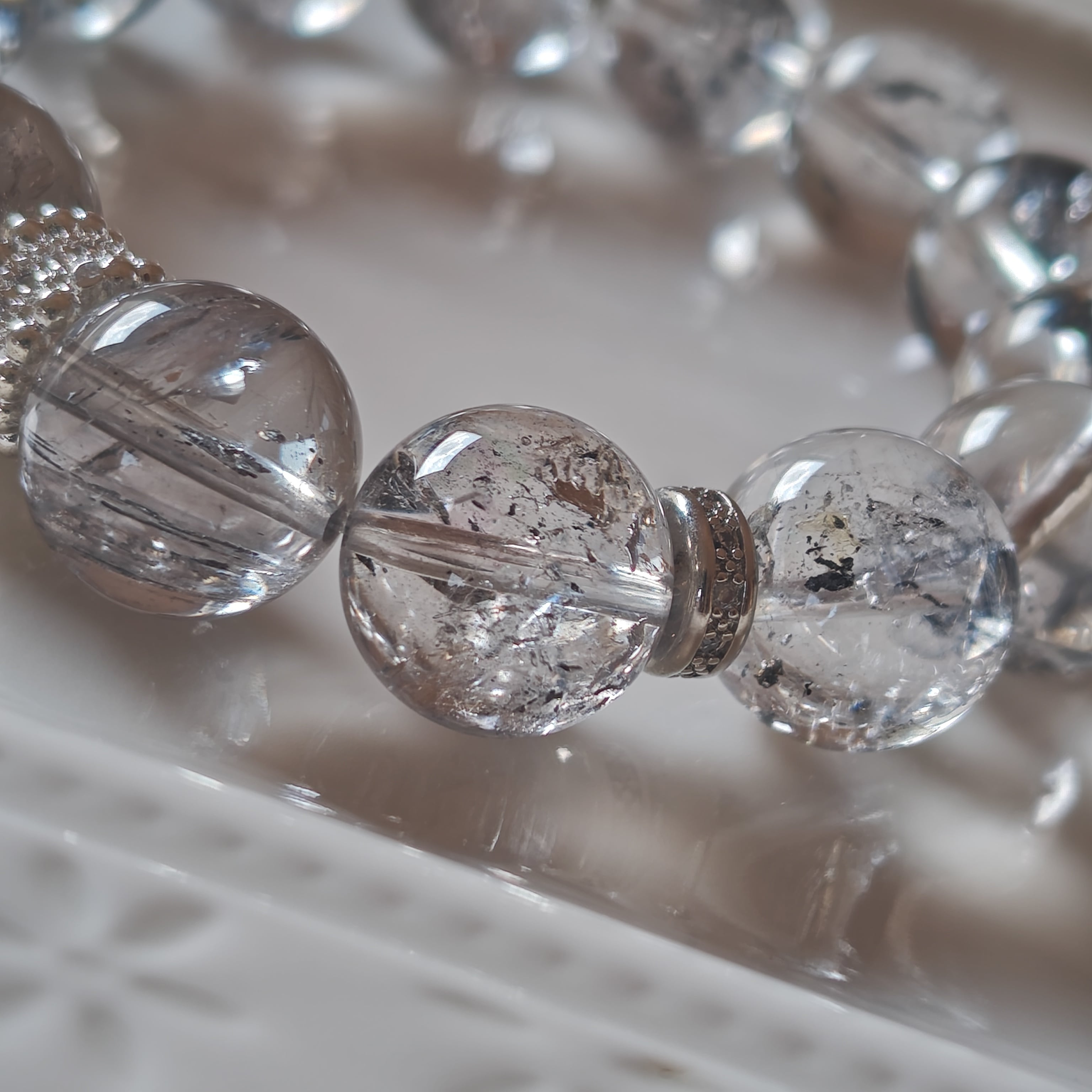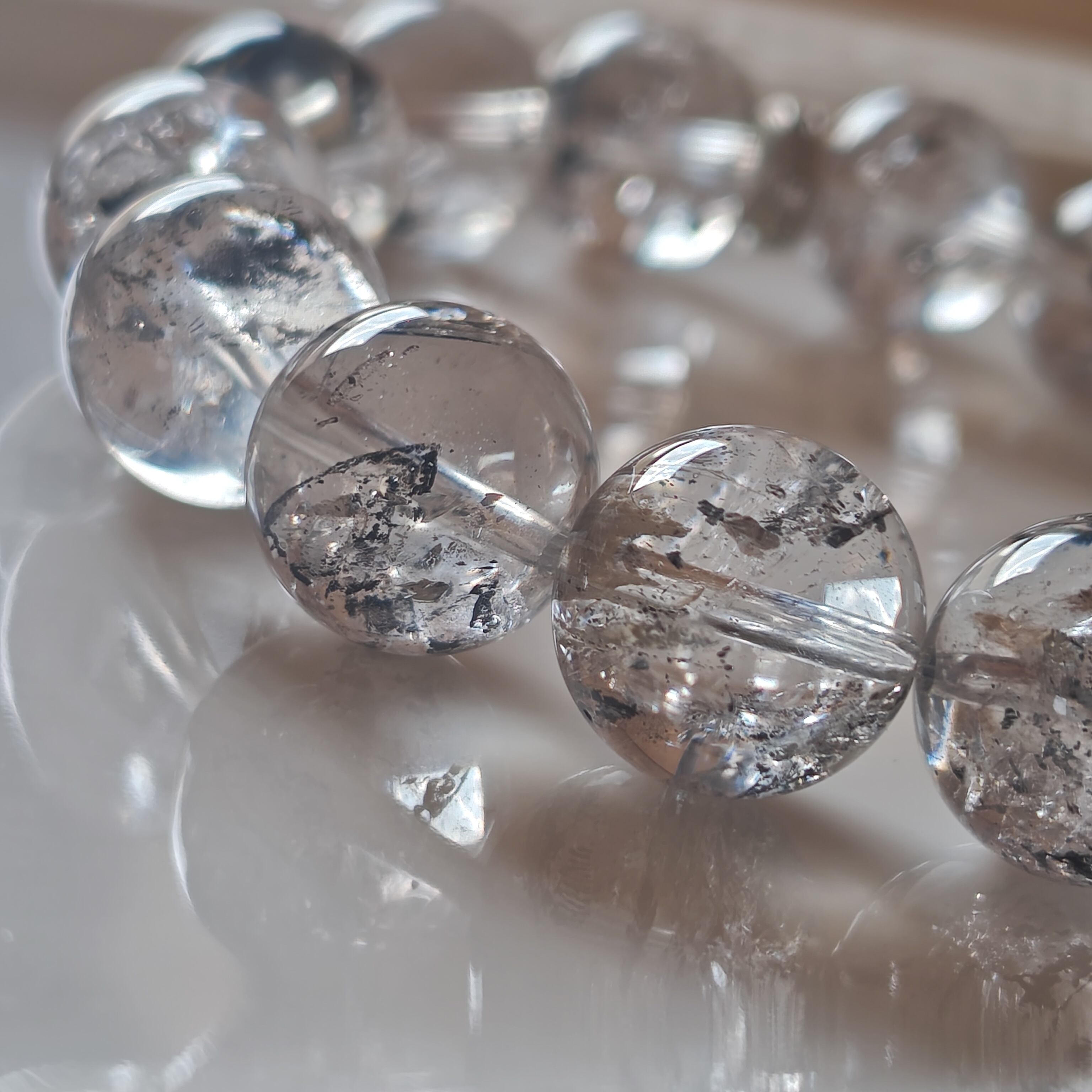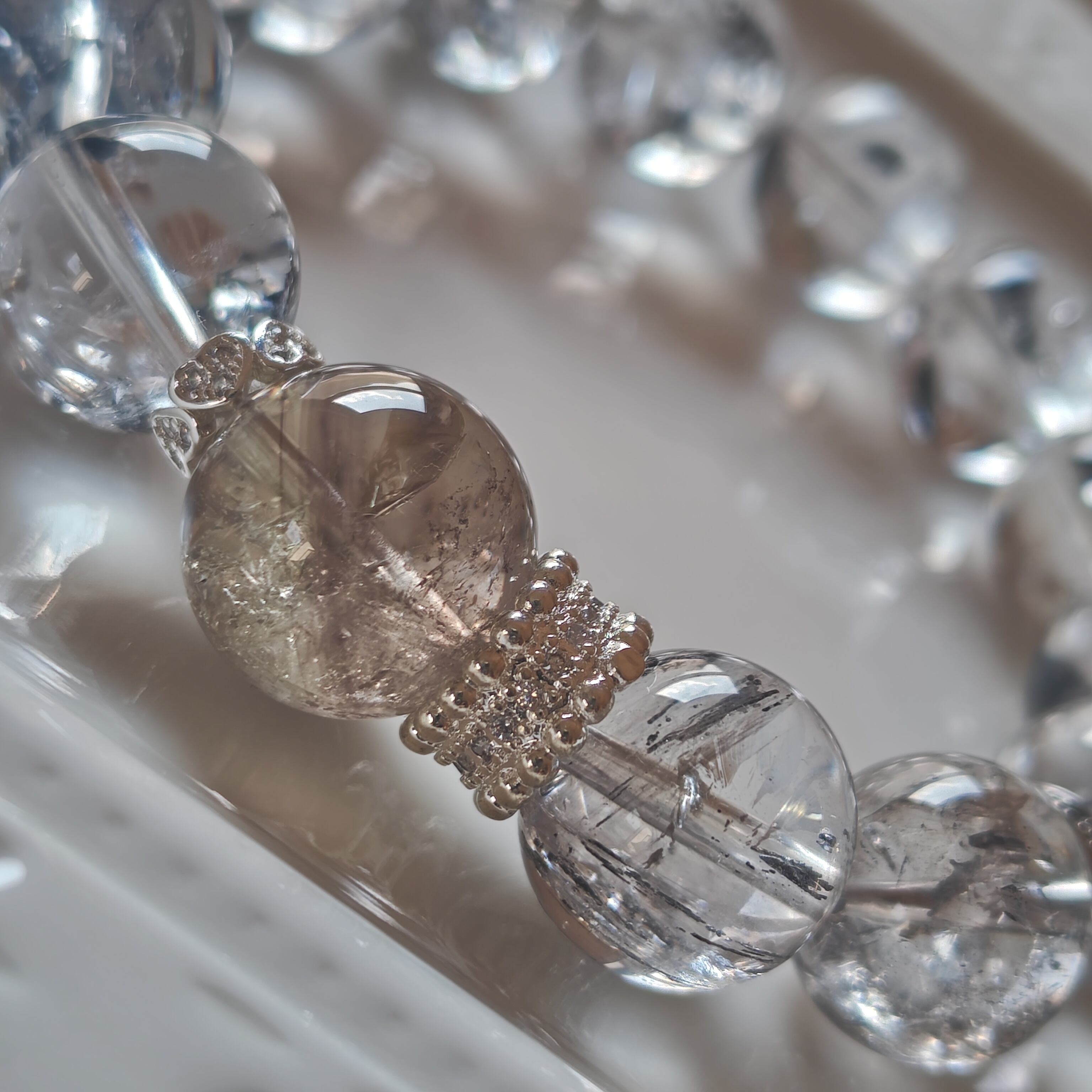 エレスチャルクオーツは、過去からの記憶を持ち、持ち主のスピリチュアルな成長をサポートするパワーストーンとして知られています。また、ゼウスクオーツは、力強さと安定感を与えることで、自己実現を促すストーンです。これらの石が組み合わさることで、内面的な強さと平和をもたらすブレスレットになりました(^^)