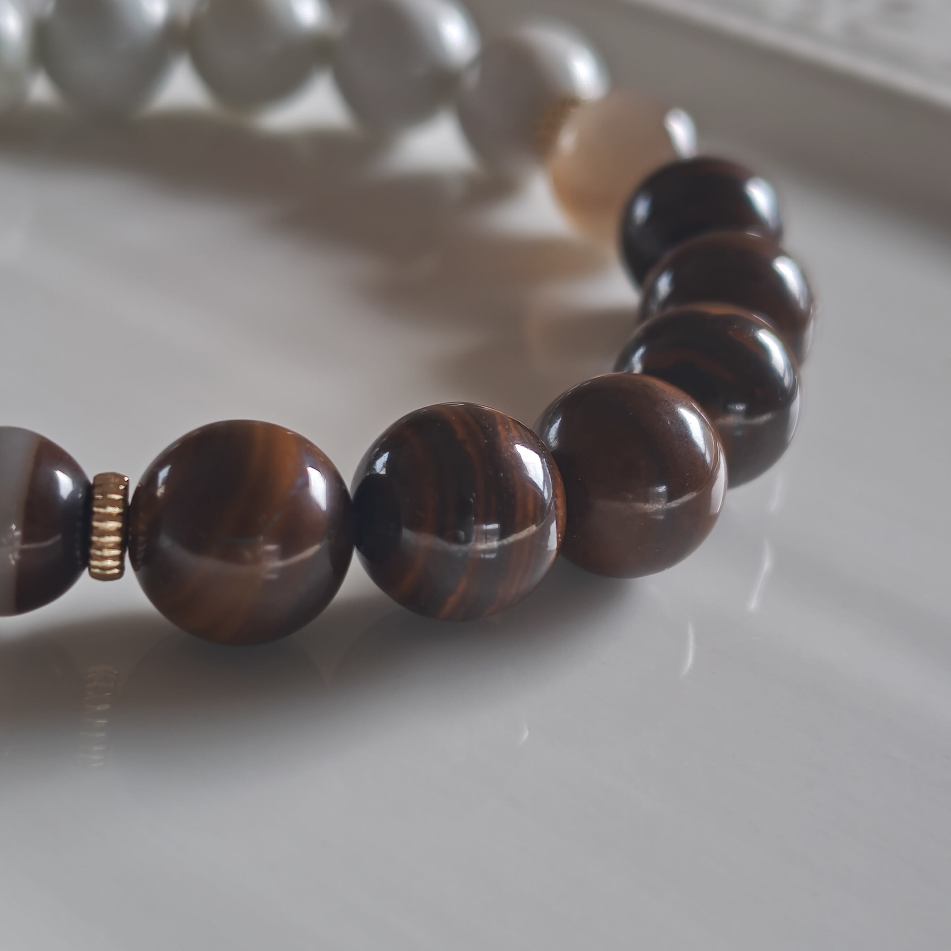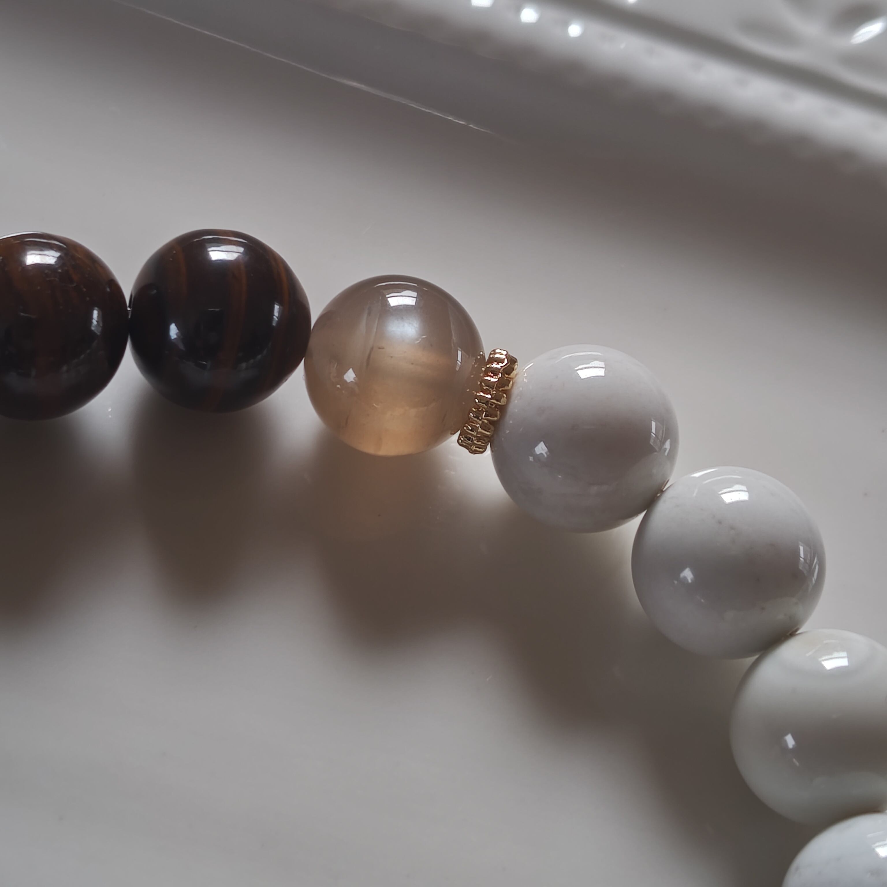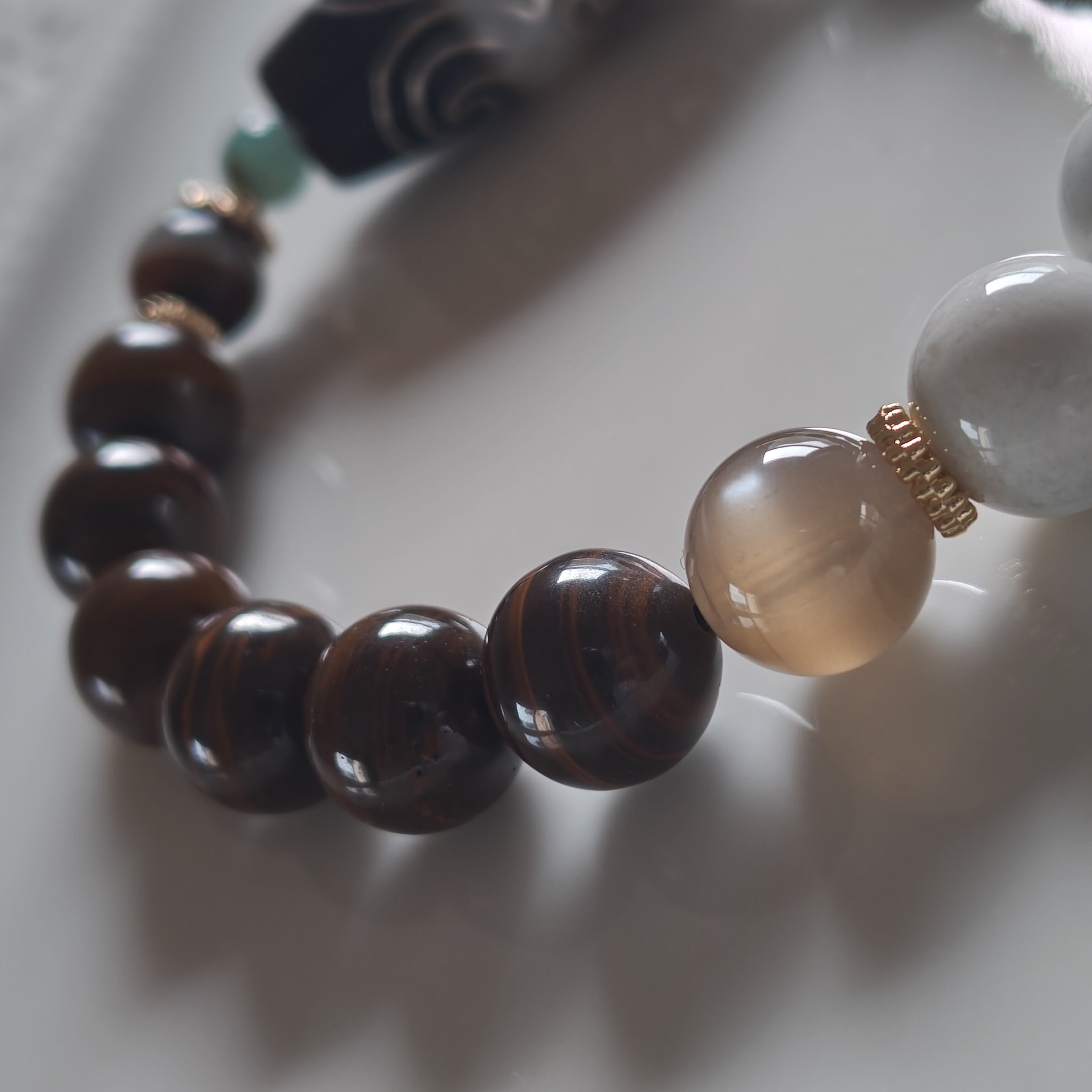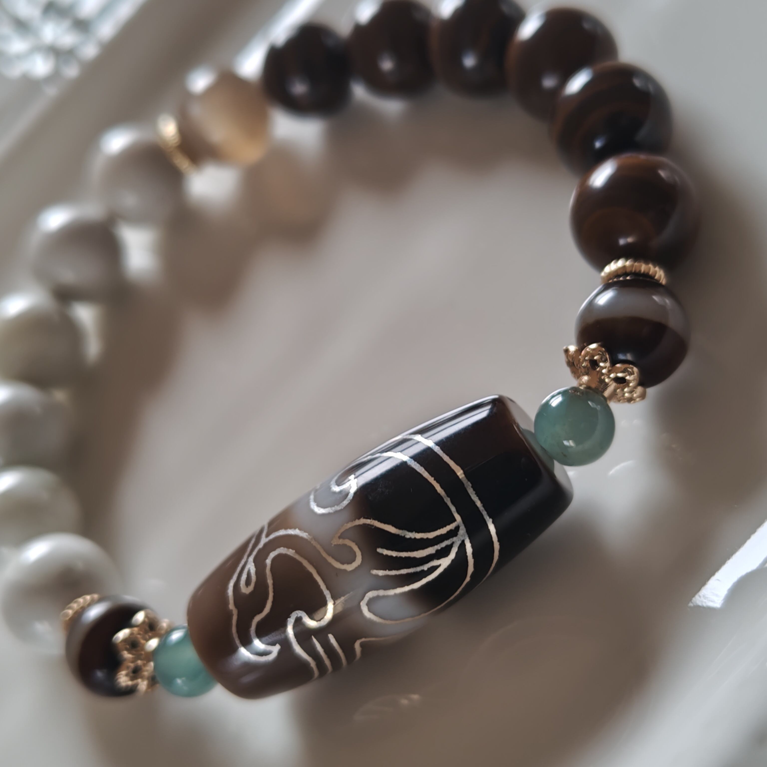 魅力的なカフェモカハーフカラーの銀線鳳凰天珠とホワイトミルクアラシャンとボルダーオパールを組み合わせたブレスレットになります。