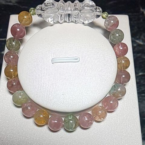 こちらは可愛らしいキャンディカラーのトルマリンで、キャッツやバイカラーも何粒か見れ透明感もあり大人可愛いブレスです(^-^)