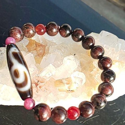 合わせましたのがガーネットとヌーマイトの共生◆癒しの石と言われているヌーマイトインガーネットに両サイド葡萄瑪瑙を二粒と天珠両サイドにはルビーを配置しました♪