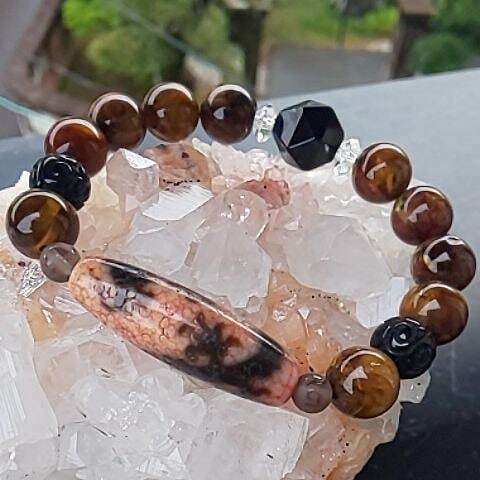 天珠対面は漆黒モリオンのスターカットを両サイドにはモリオン回紋珠を組みました♪