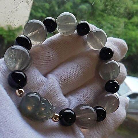 綺麗なフェザーの14㎜UPの大玉エンジエルフェザーフローライトとブラックスピネルに強シラーのラブラドライト貔貅(ひきゅう)さんを組みました♪