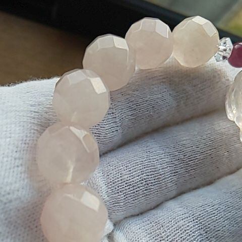 ローズクオーツのカットタイプと非常に美しいマダガスカル産ラズベリークオーツとルビーで品の良い可愛らしさのあるブレスです♪
