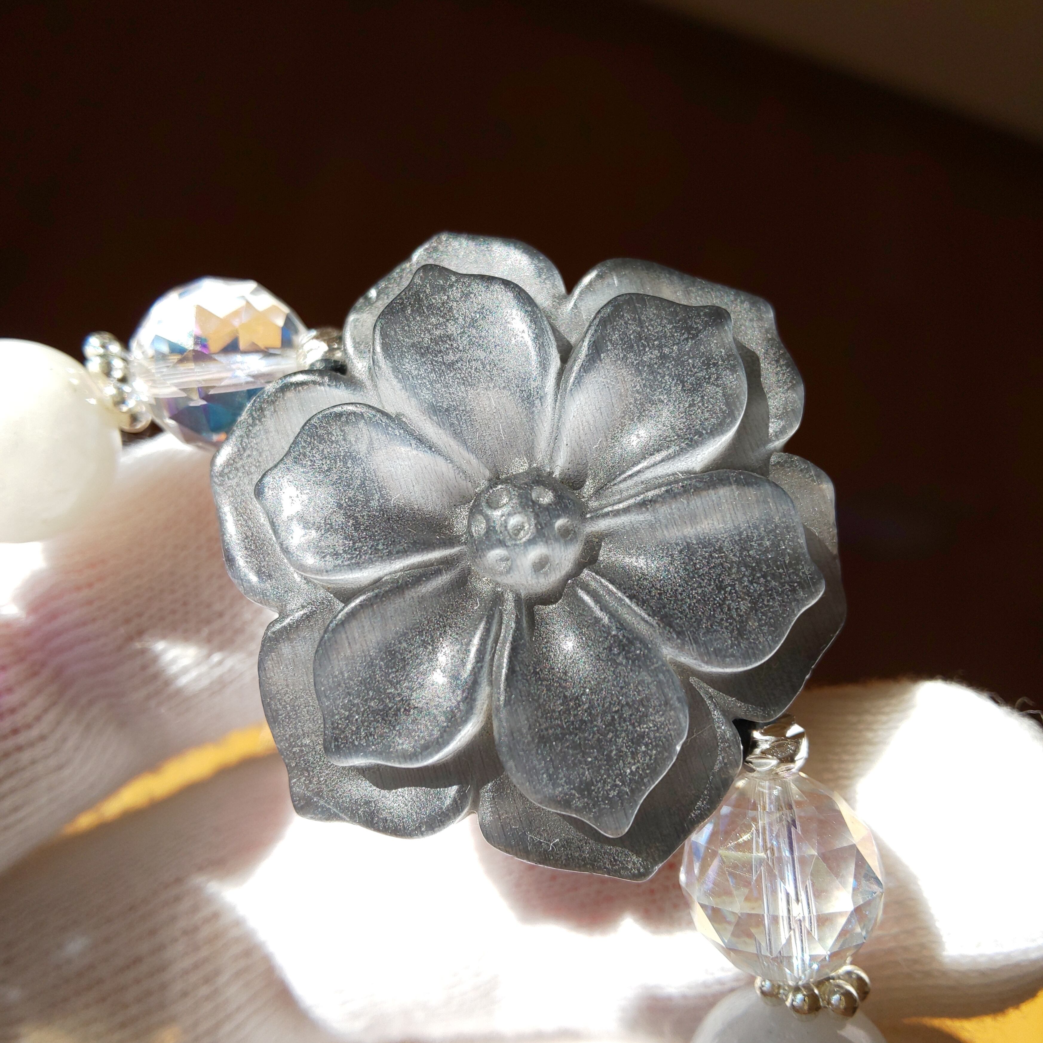 こちらはグレー系のキャッツアイのお花パーツを使ったデザインブレスになります♡