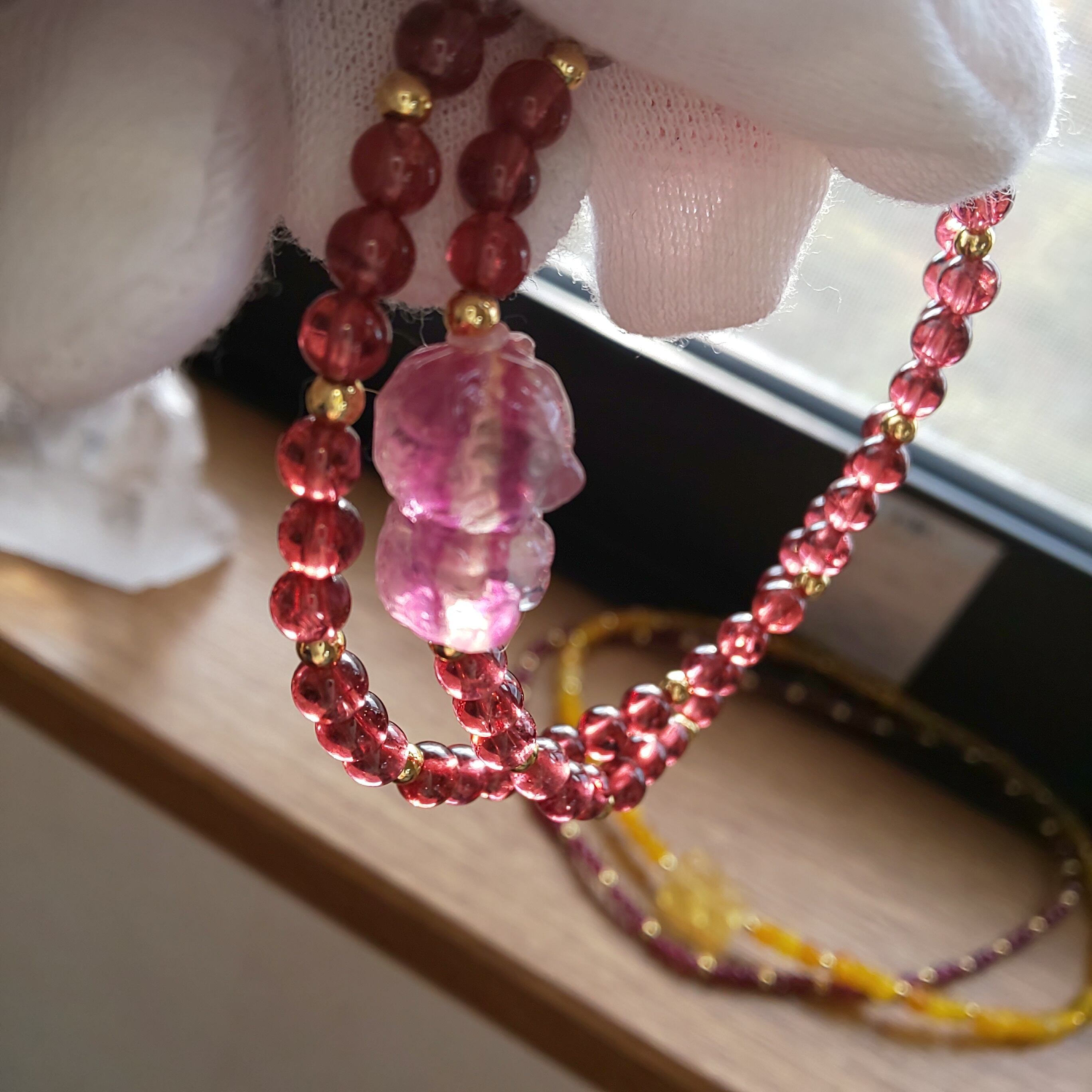 新作♡ピンクフローライトくま × ガーネット 二連ブレス