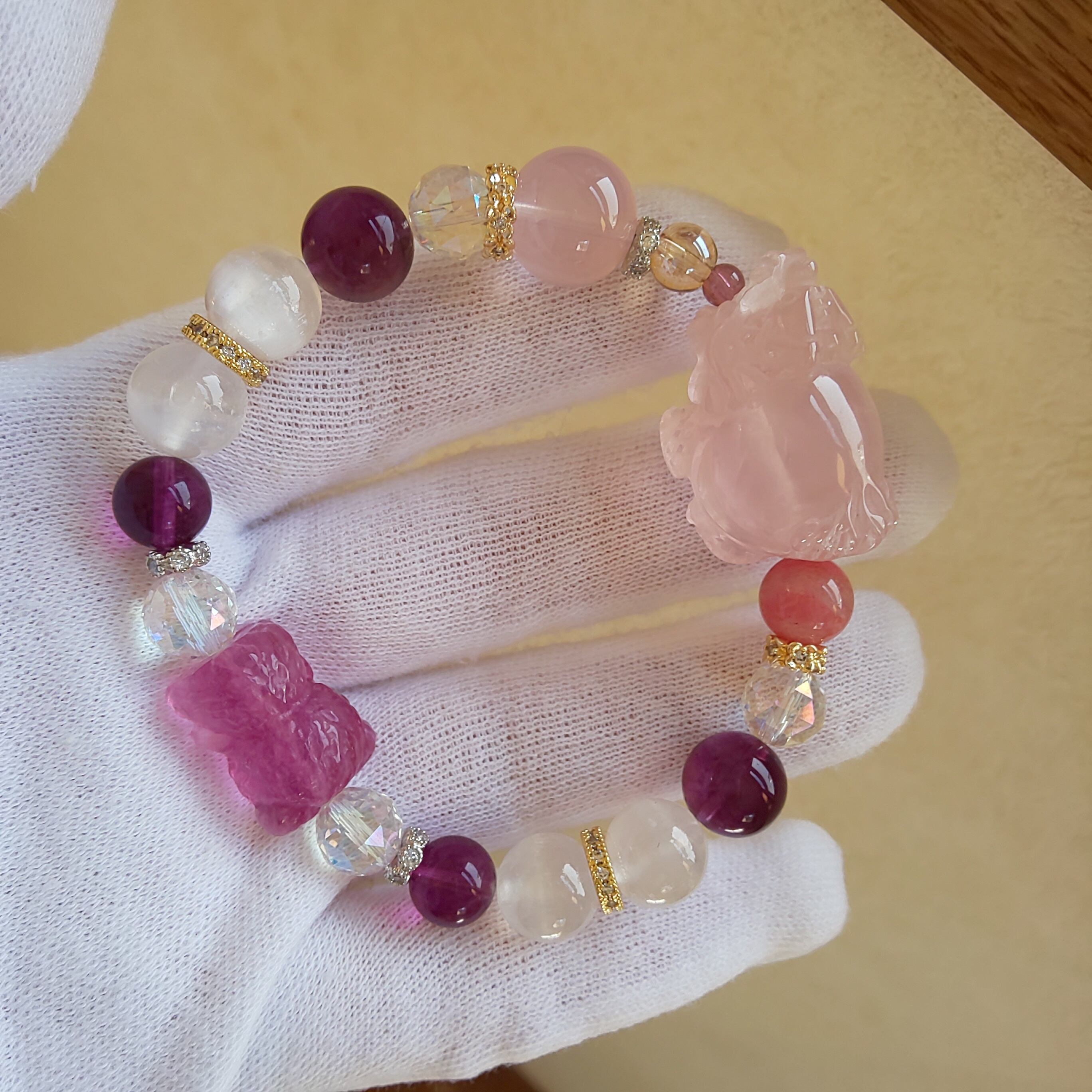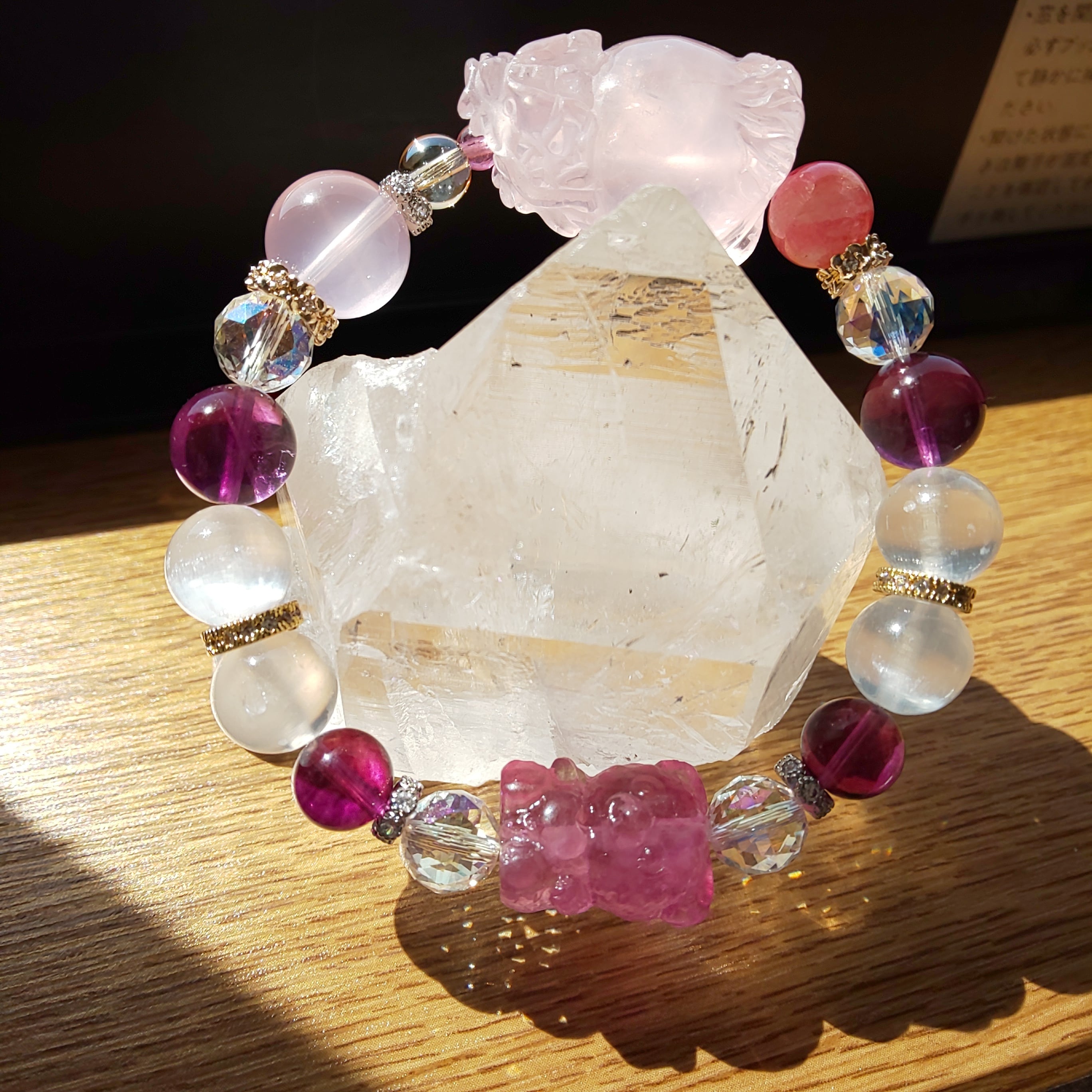ローズクオーツのロングイさんとピンクパープルフローライトのクマさんパーツでデザインしてみました♪