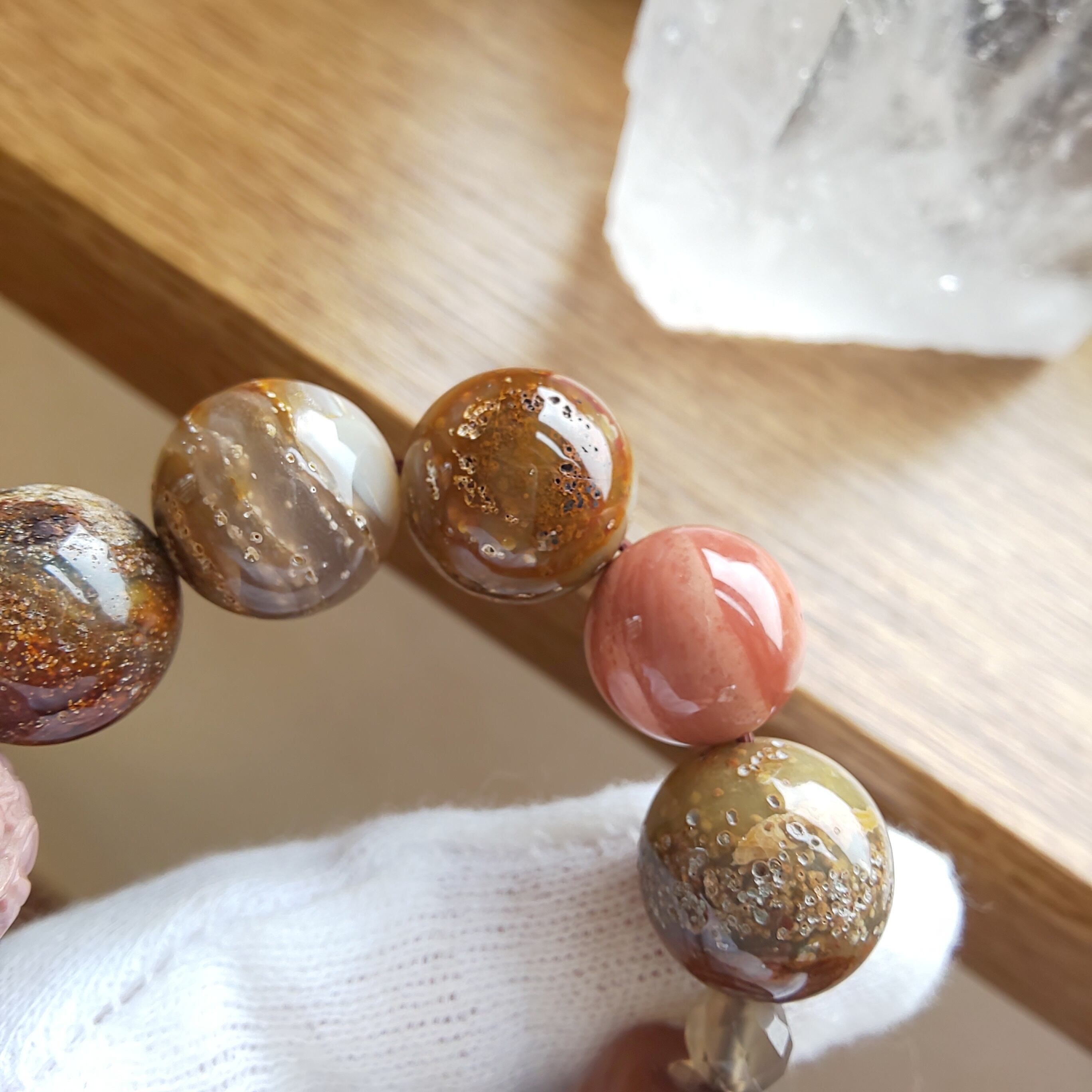 「調和・共生・健康」です。 古くから装飾品や印章として珍重されてきた「瑪瑙」は、パワーストーンとしても強い力を持ちます。 さまざまな結晶が重なることで生成された瑪瑙には、人との絆を深め、関係を良好に保つ効果があると言われます。