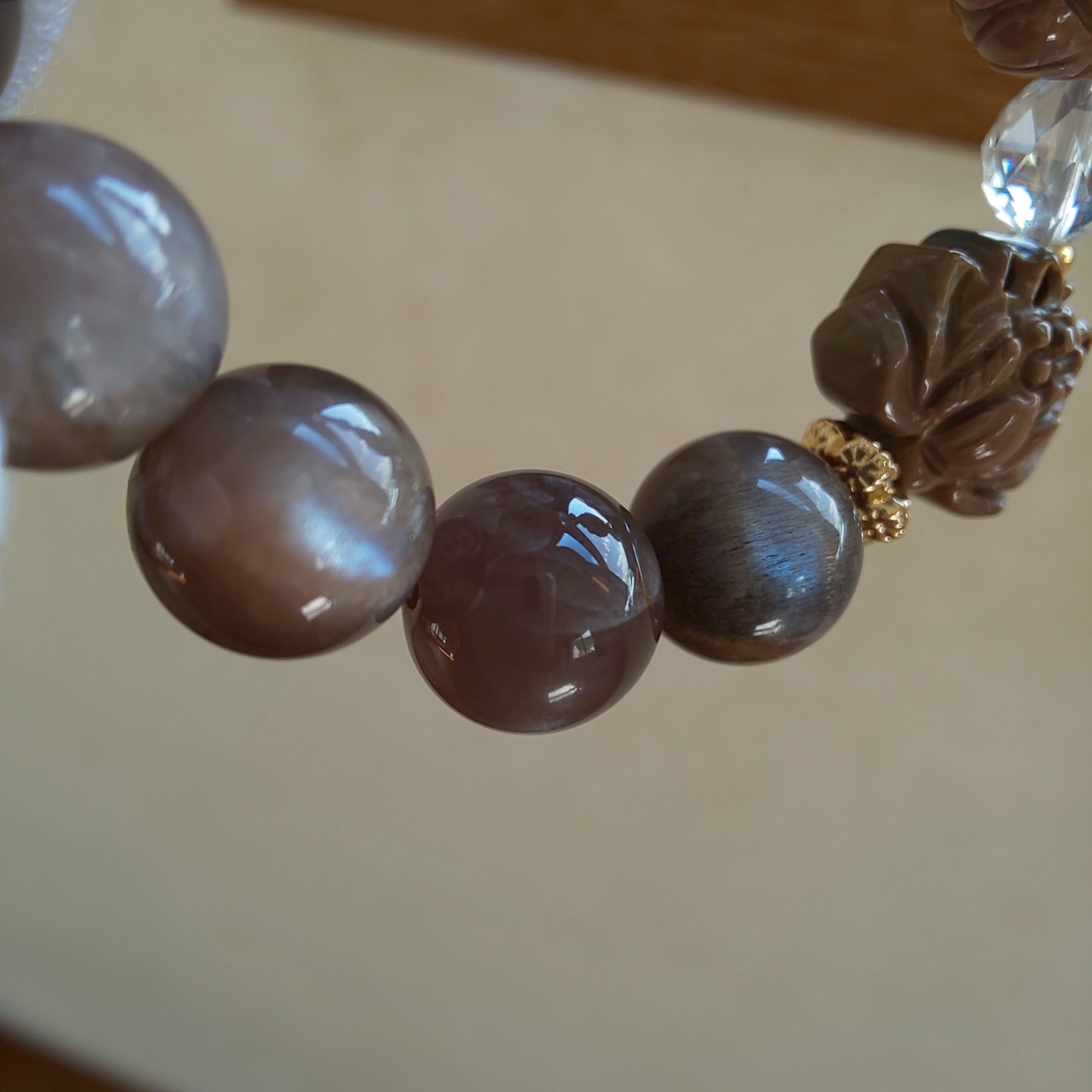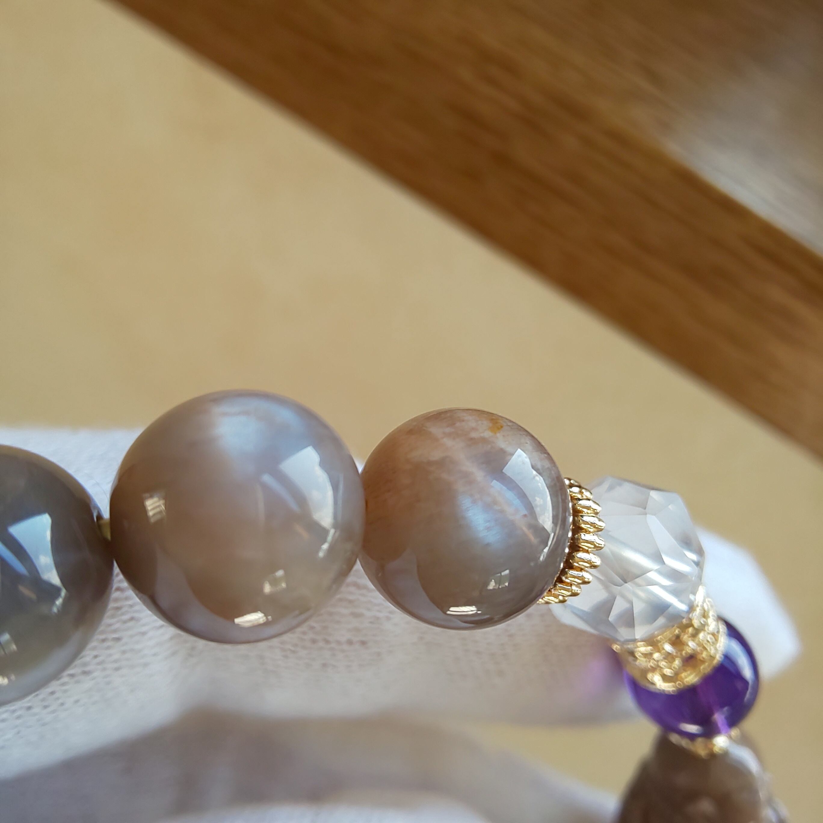 ベースのブラウンムーンストーンですが私は一応ブラウンのムーンストーンとして仕入れしましたが、届いて見ましたらサンムーンの粒もありブルーシラーが一粒に点々と光っていたり、何だか妖艶な色気のある、レアなムーンストーンです♡