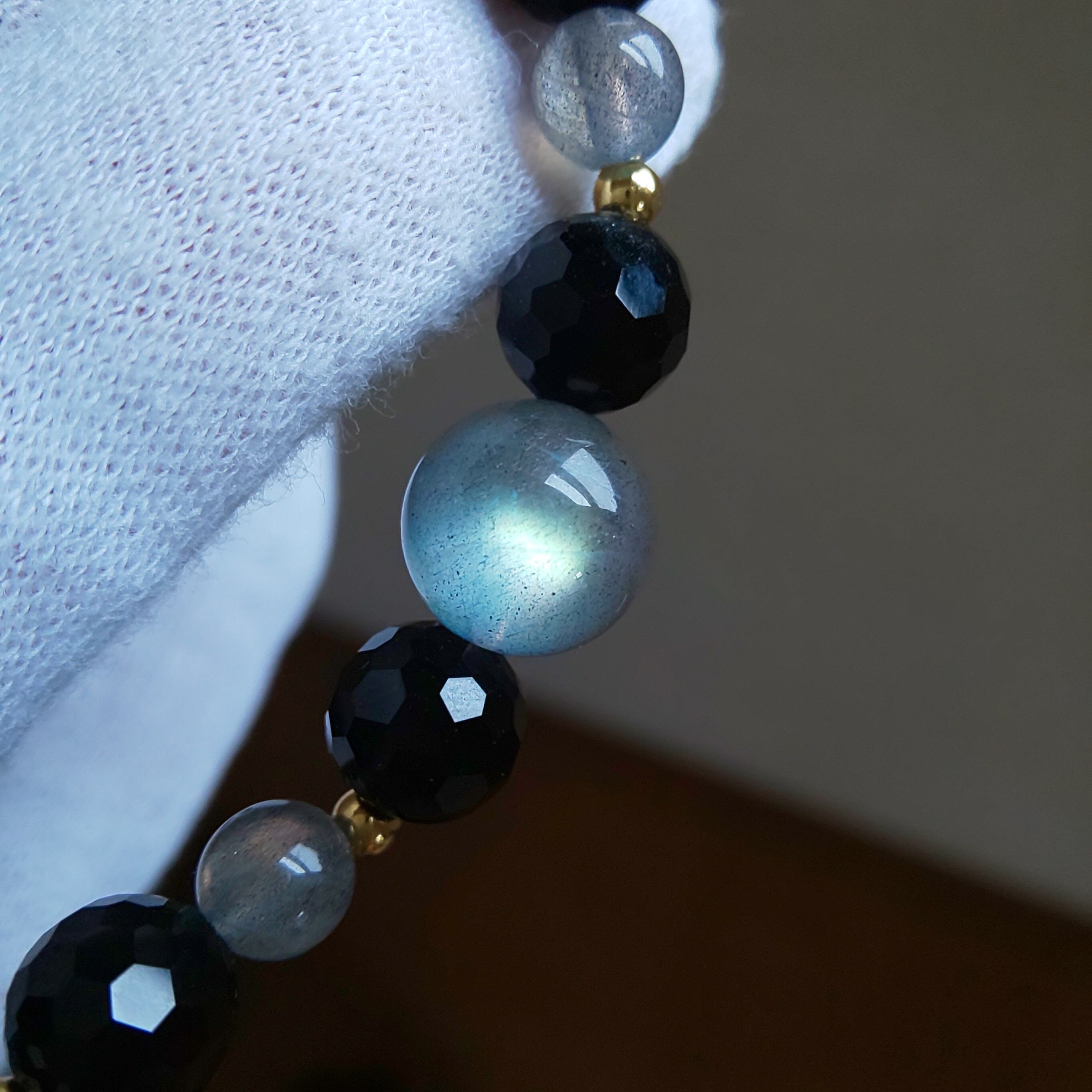 宝石カットモリオンブレスはとても美しいゴールドブルーシラーのラブラドライトのガネーシャさんと、そのシラーに合わせたラブラドライトの丸玉を選んで組みました♪