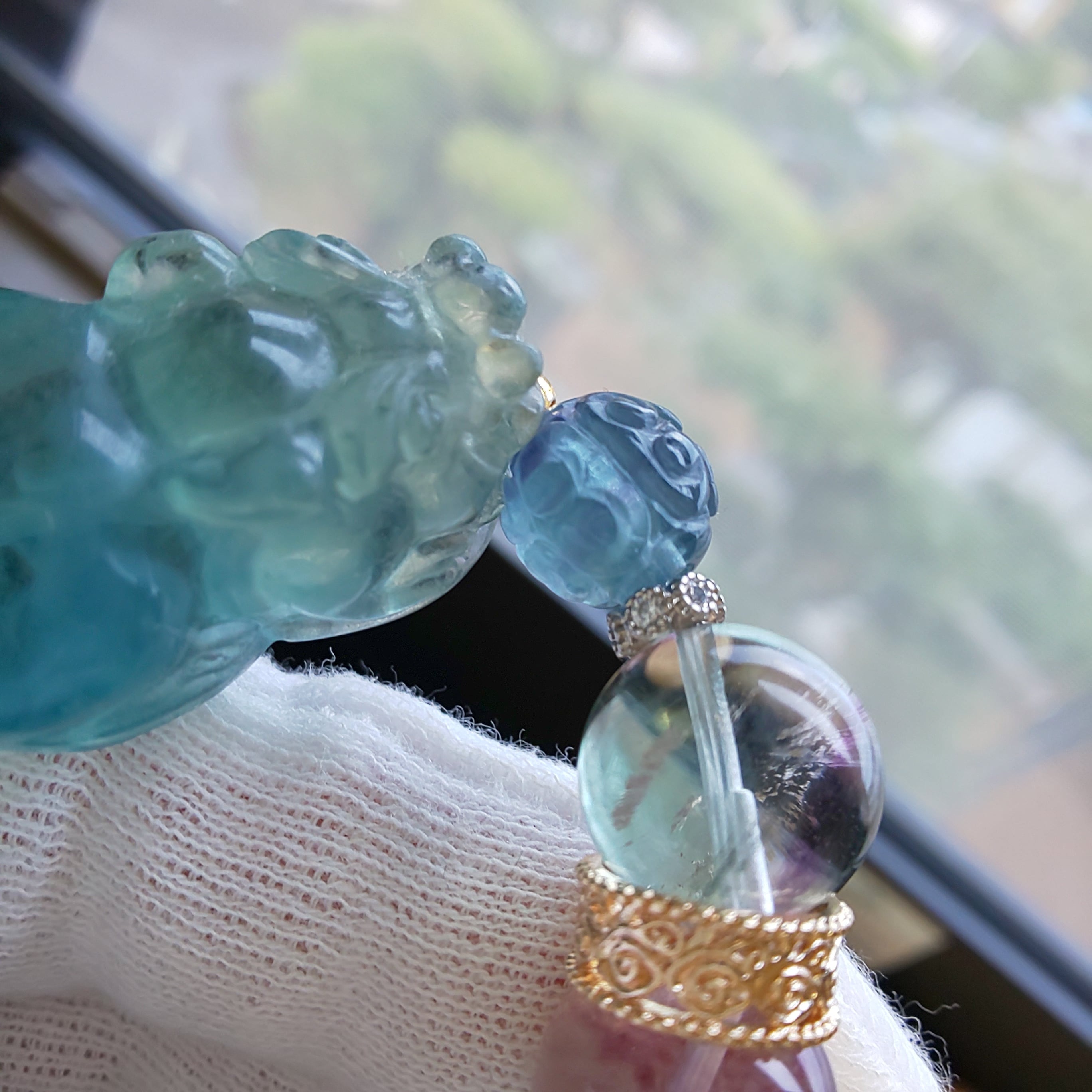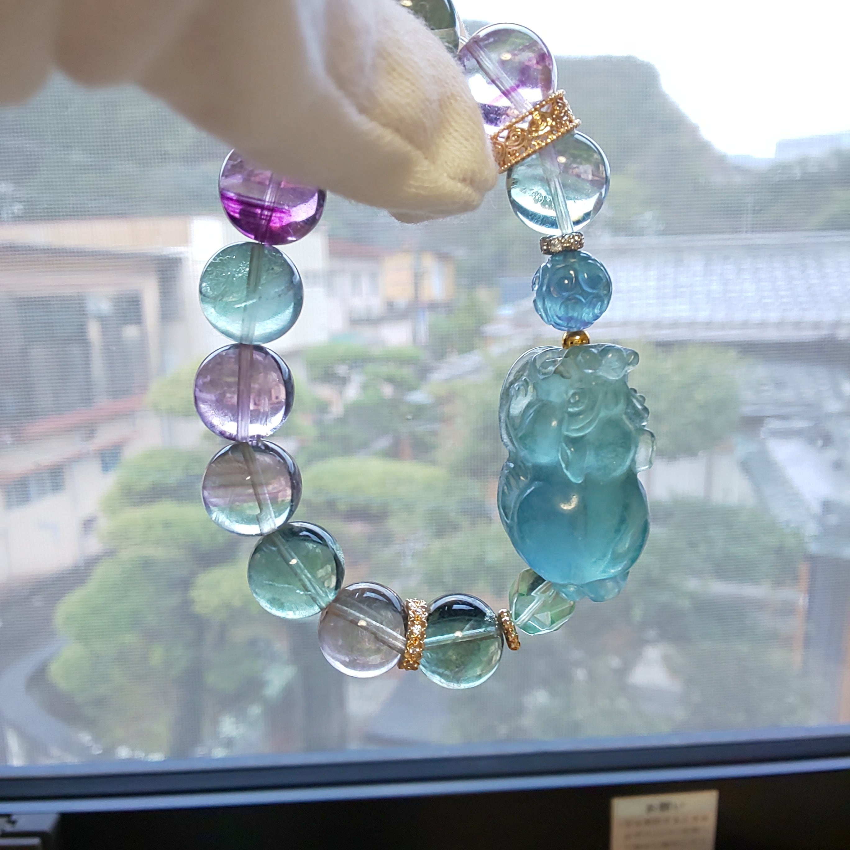 ブルーとグリーンのバイカラーフローライト貔貅とレインボーフローライトで組みました♪