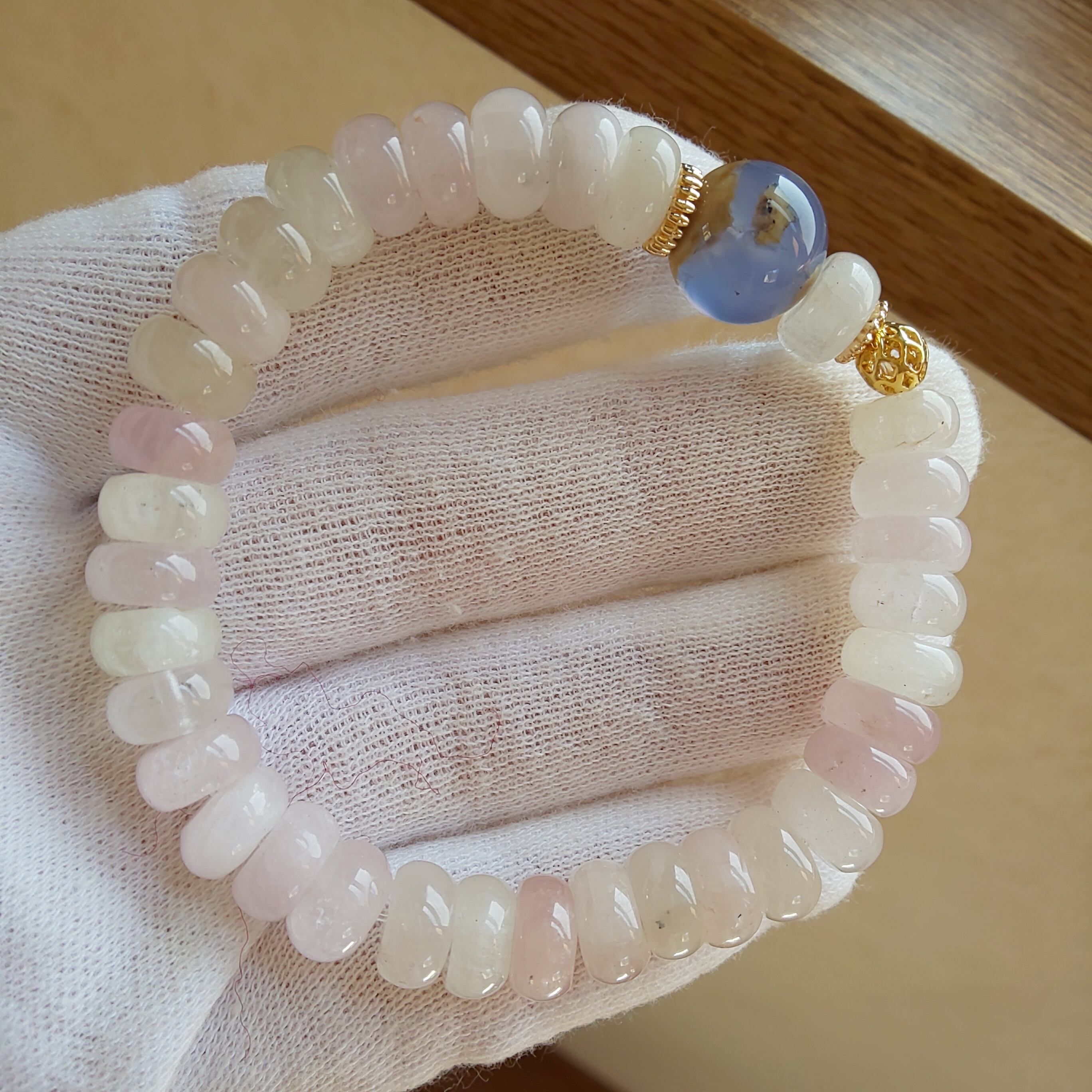 とっておきの母岩つきブルーカルセドニーをトップにクンツァイトのぷっくりボタンで作成しました(^-^)