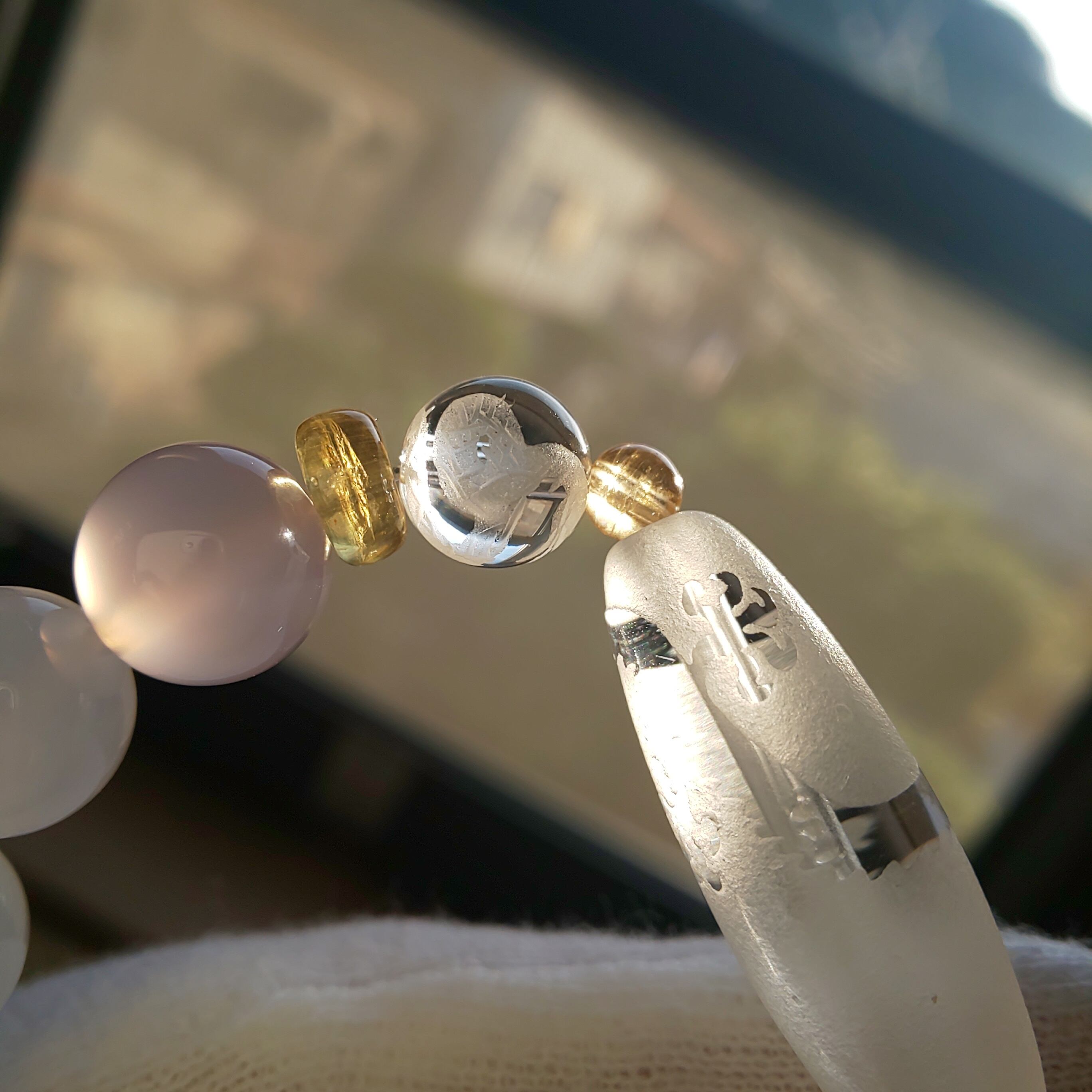 こちらは、水晶の五本爪龍神天珠とホワイトカルセドニーをベースに、ラベンダーカルセドニーと対面はウルグアイ産アメジスト、天珠両サイドはイエロートルマリンと水晶白蛇彫りで仕上げました♪