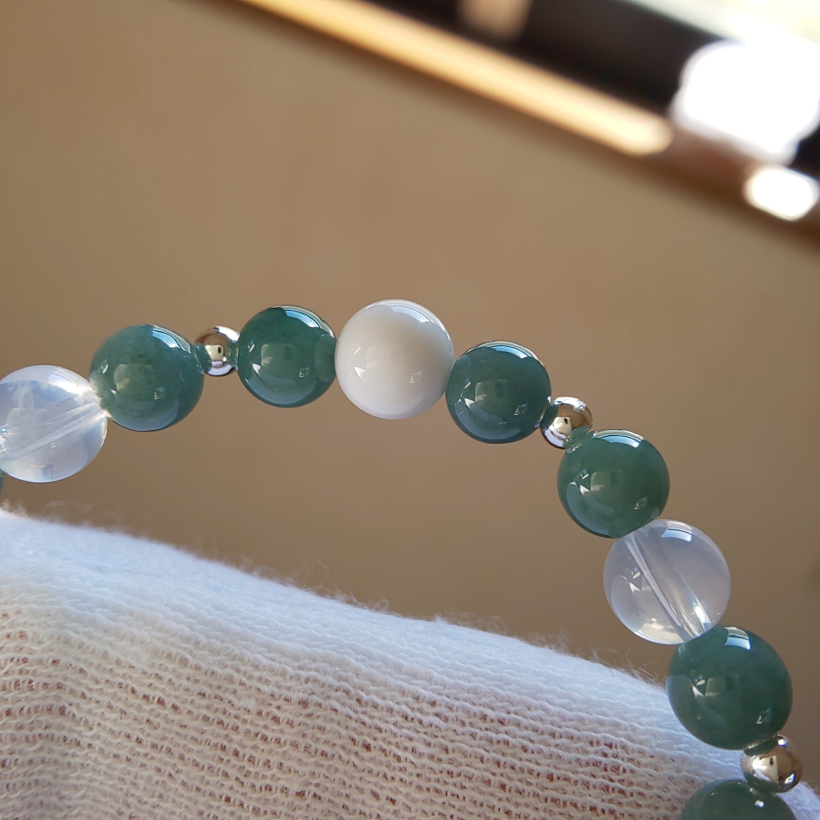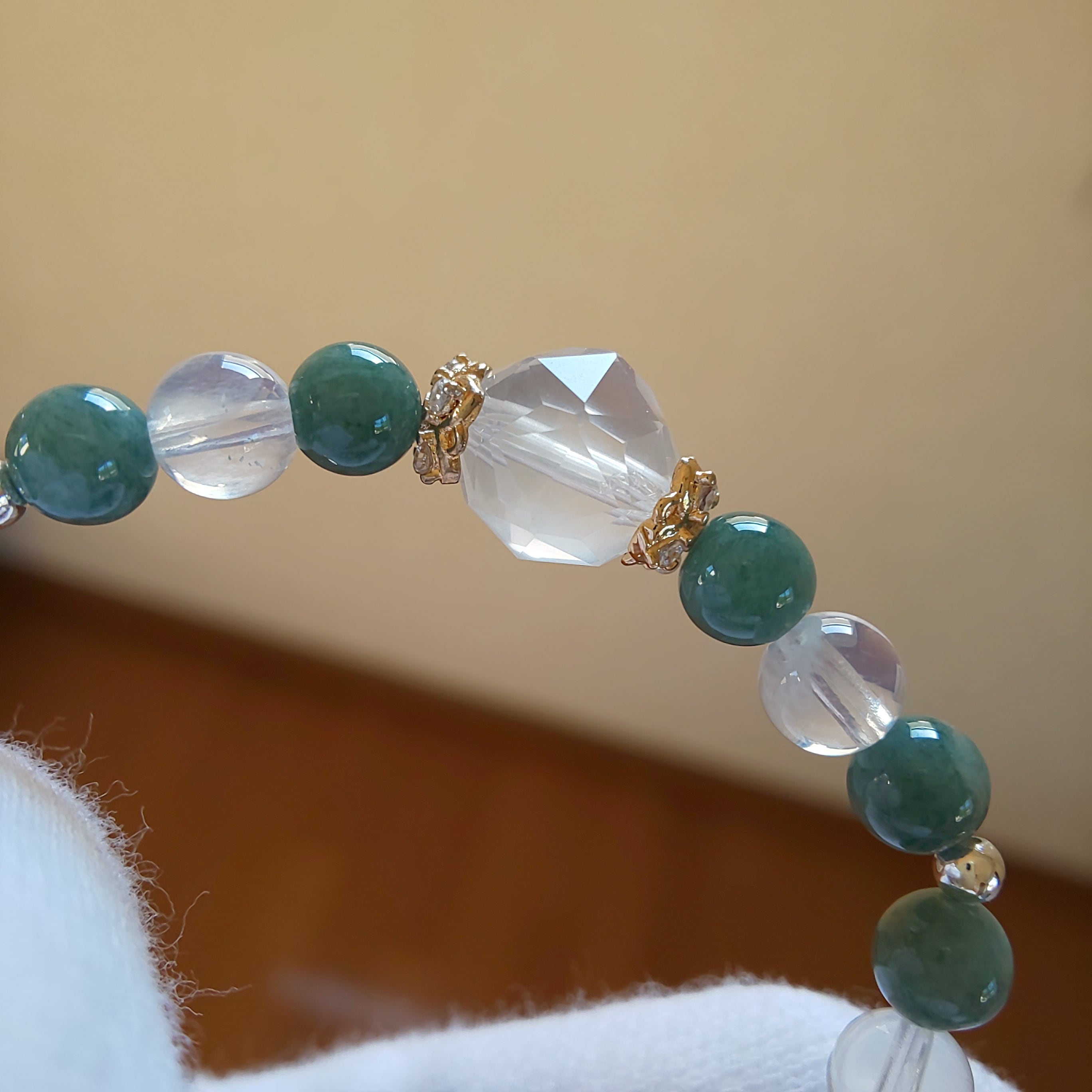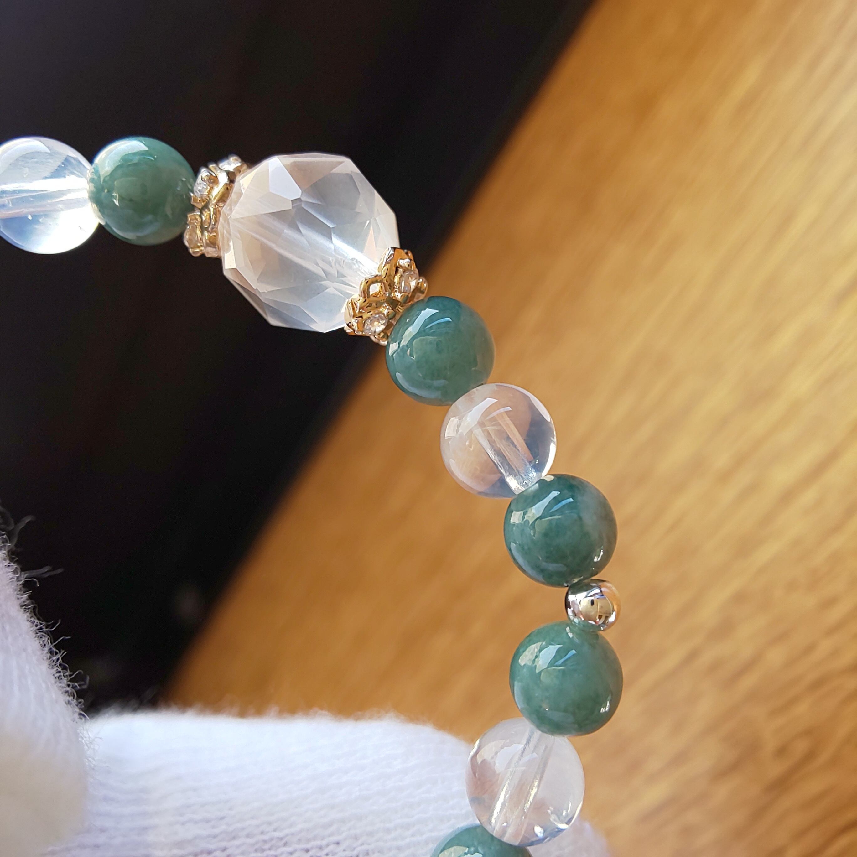 こちらは先日の小粒グアテマラ産翡翠ブレスの組み替えになりますが、トップをムーンクオーツのスターカットに変更して対面には無処理のホワイトオニキスを一粒、シルバーカラーの金粒で組みました(^-^)