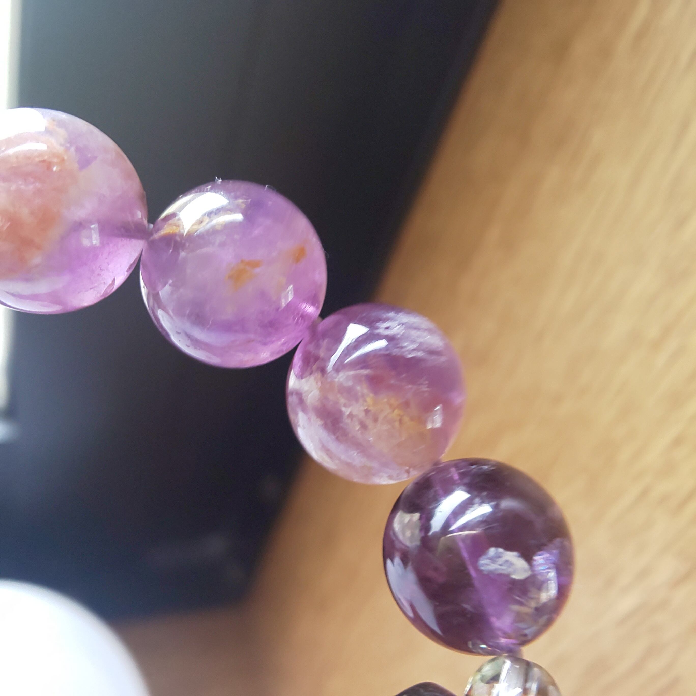 温かみのある手作りの二眼天珠とガーデンアメジストで優しいブレスに仕上げました♪