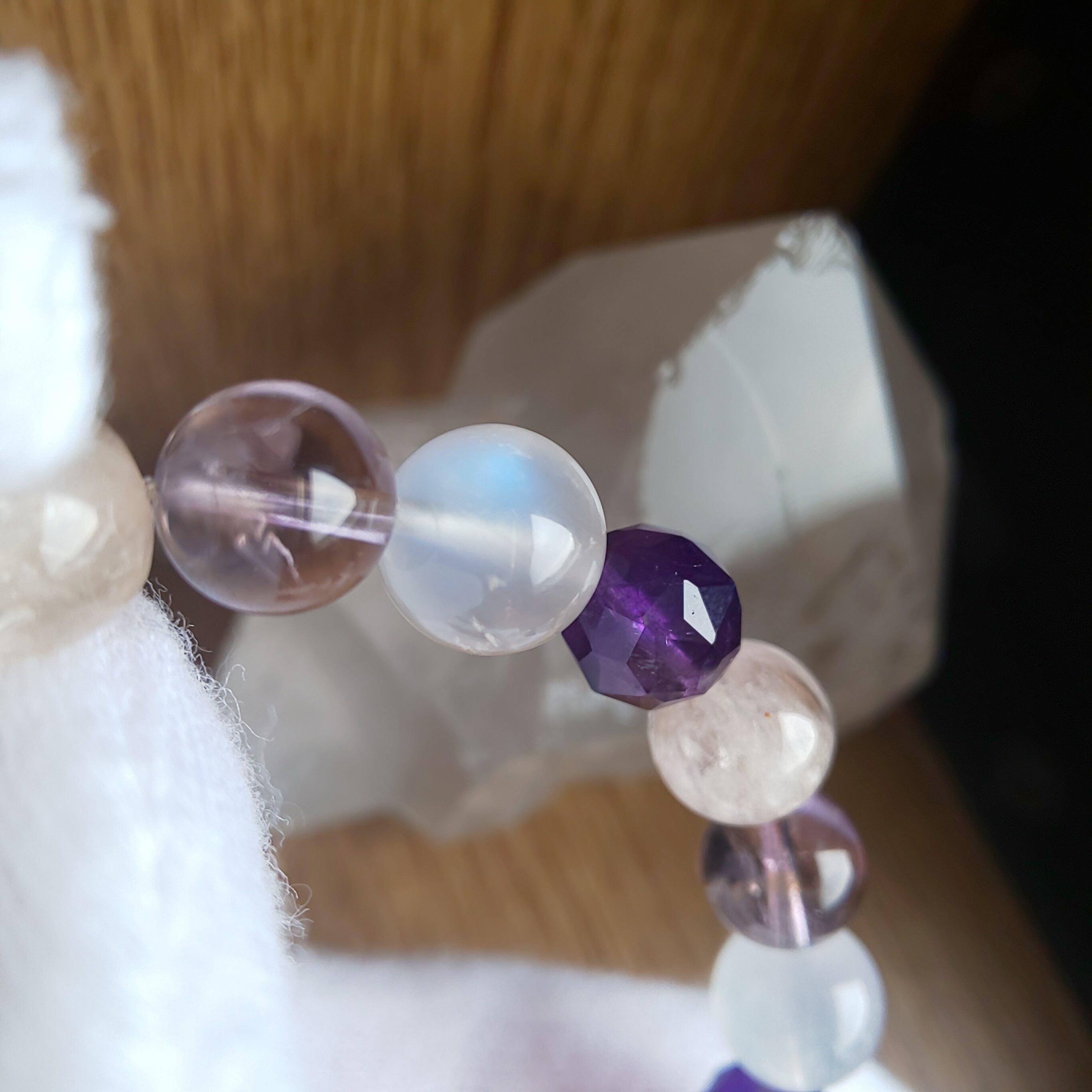トップはアメジストで、ベースの部分は柔らかいシラーのムーンストーンとクンツァイト、ウルグアイ産アメジストのスターカット、ピンクラベンダーアメジストで組みました♪