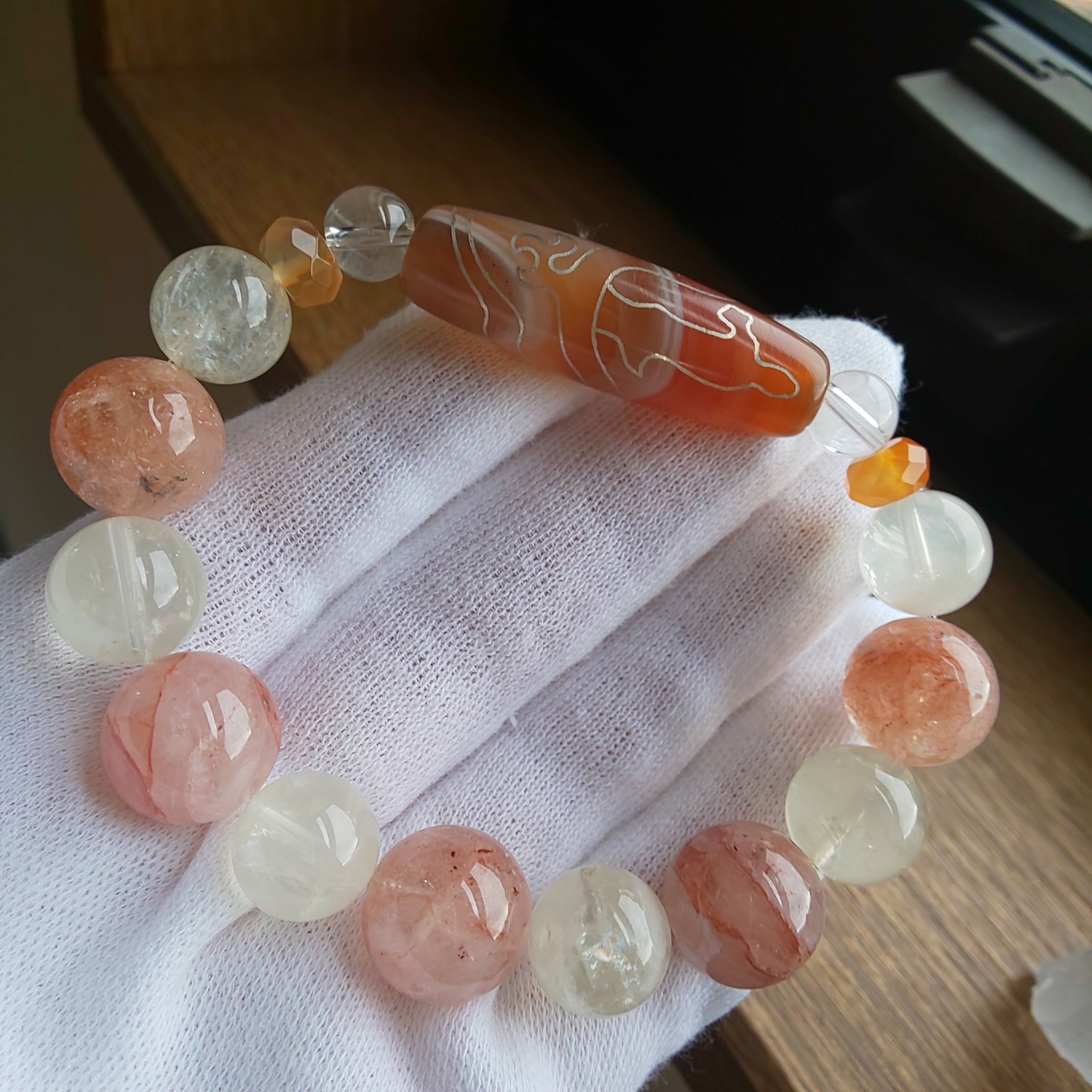 天然瑪瑙 朱砂銀線騎龍観音天珠 水晶白蛇彫り ピンクマニカラン水晶etc