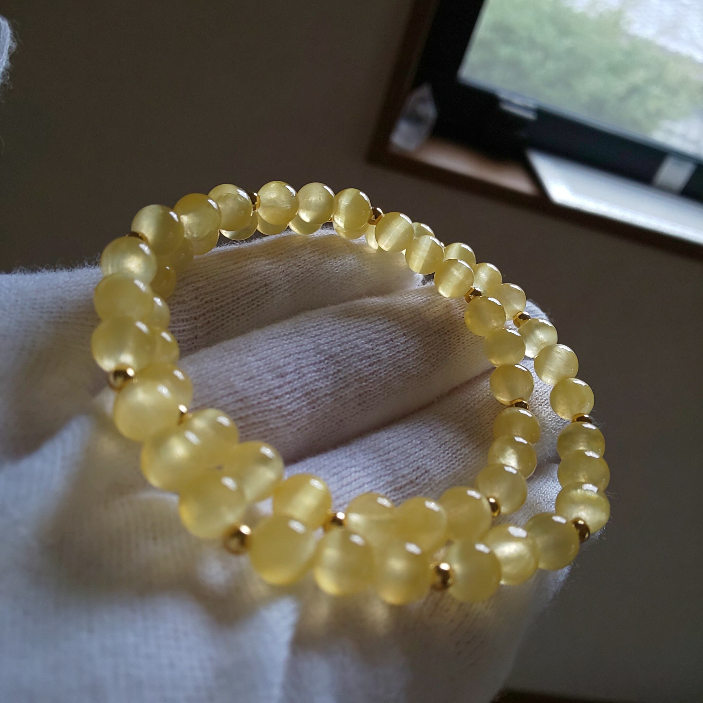 今回は珍しい天然色のゴールデンセレナイトに奇跡的に出会えましたので二連ブレスを作成しました♪