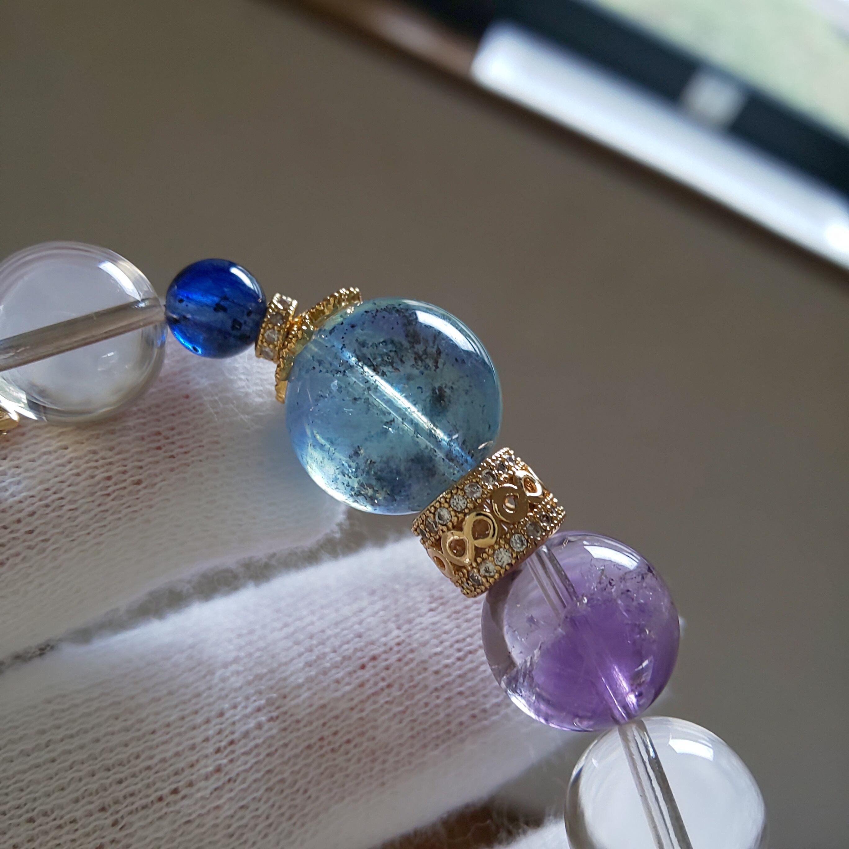 今回はトップに大玉のモスアクアマリンとファントムアメジストインクオーツ、そして小粒サファイアをさりげなく入れてみました♪