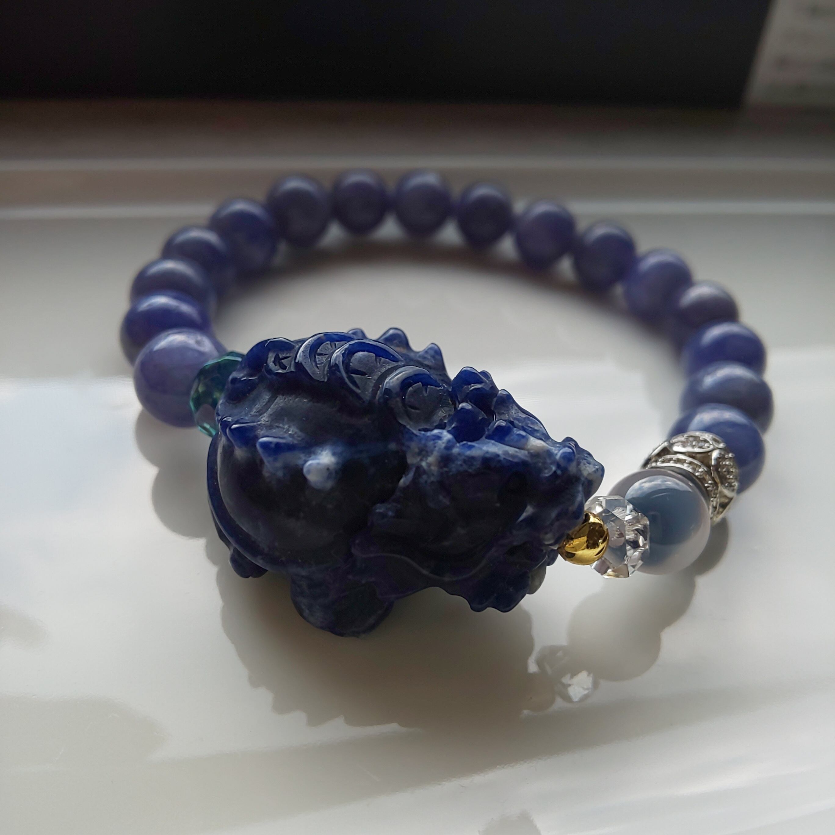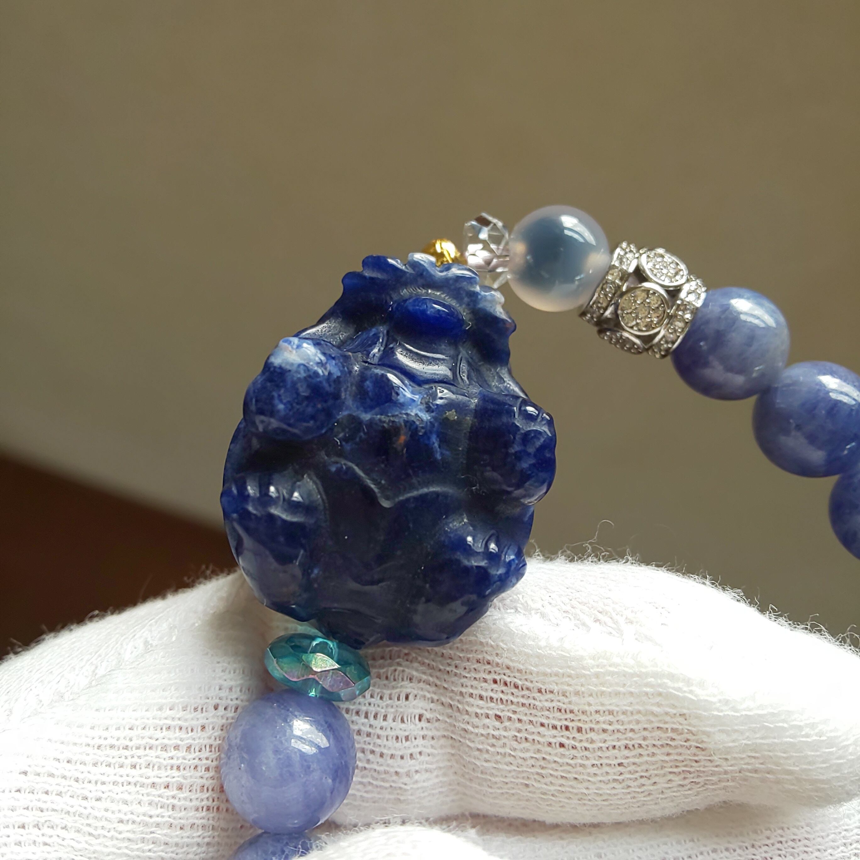 こちらはお金を背負ったソーダライトの龍亀さんとクリーミーなタンザナイトを組み合わせました♪