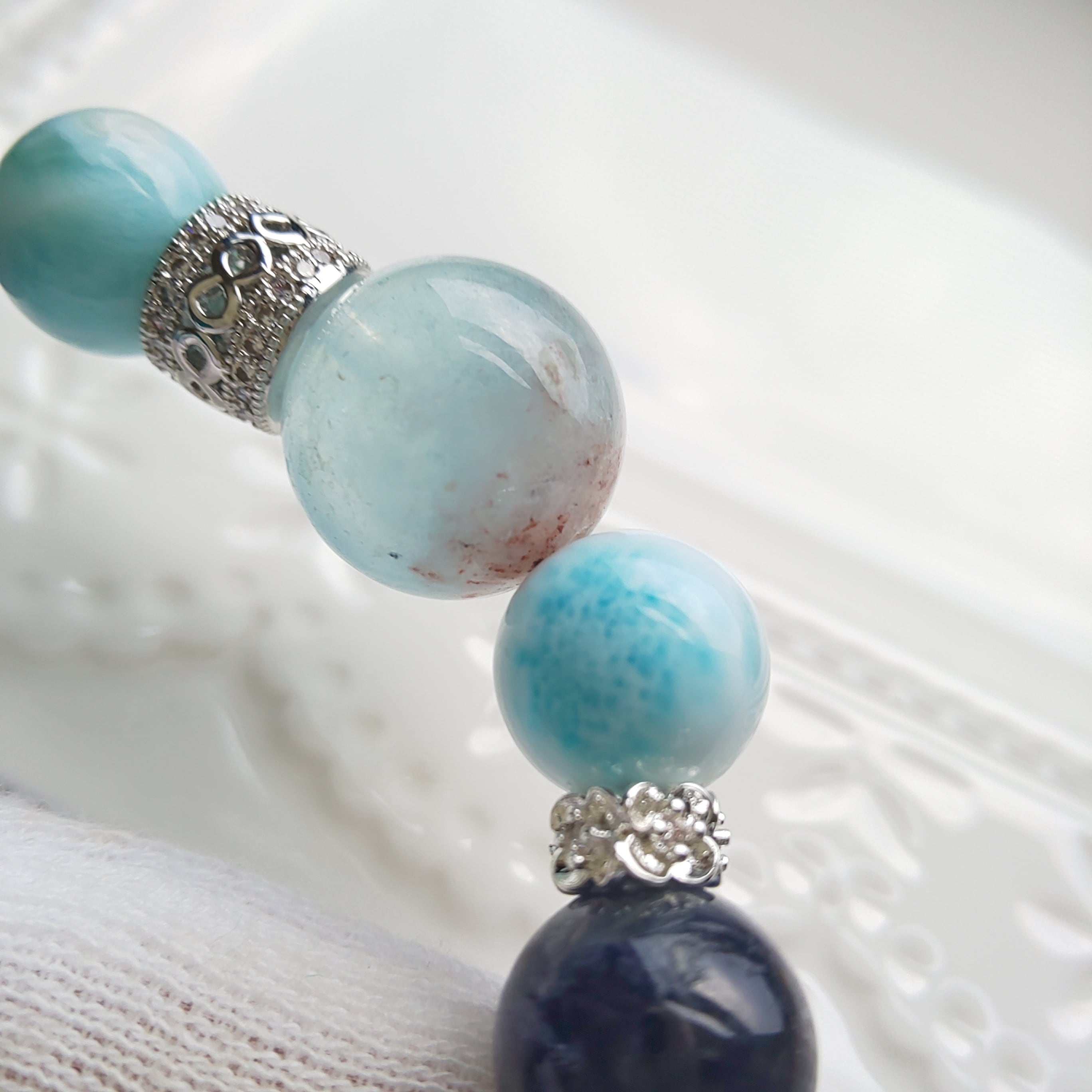 お値打ちグレードのラリマーとアイオライトに赤い母岩のあるレッドマトリックスアクアマリンをトップにしてみました(^-^)
