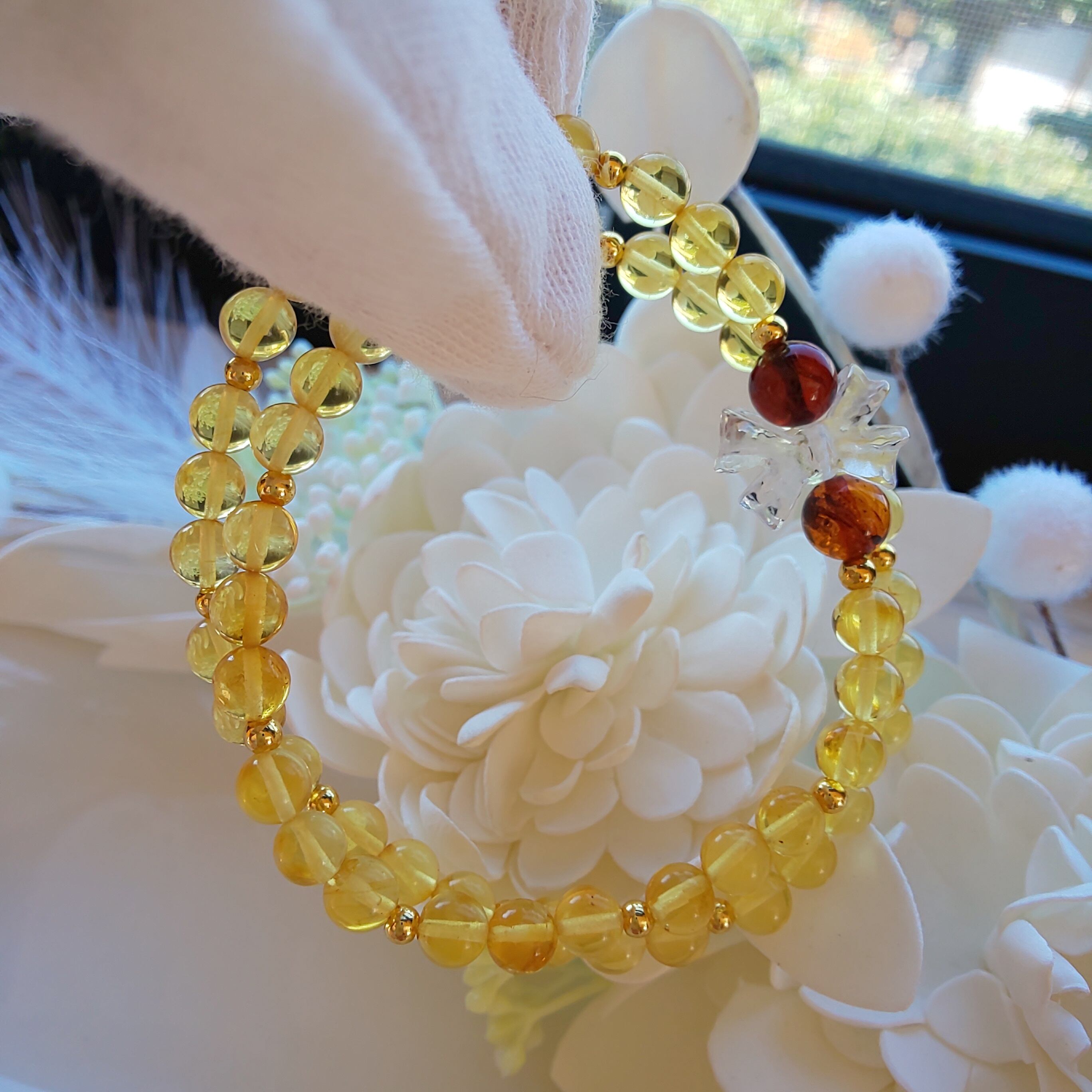 こちらは濁りの無いハニーレモンアンバーの二連ブレスに水晶リボンとブランデーカラーアンバーを忍ばせました♡