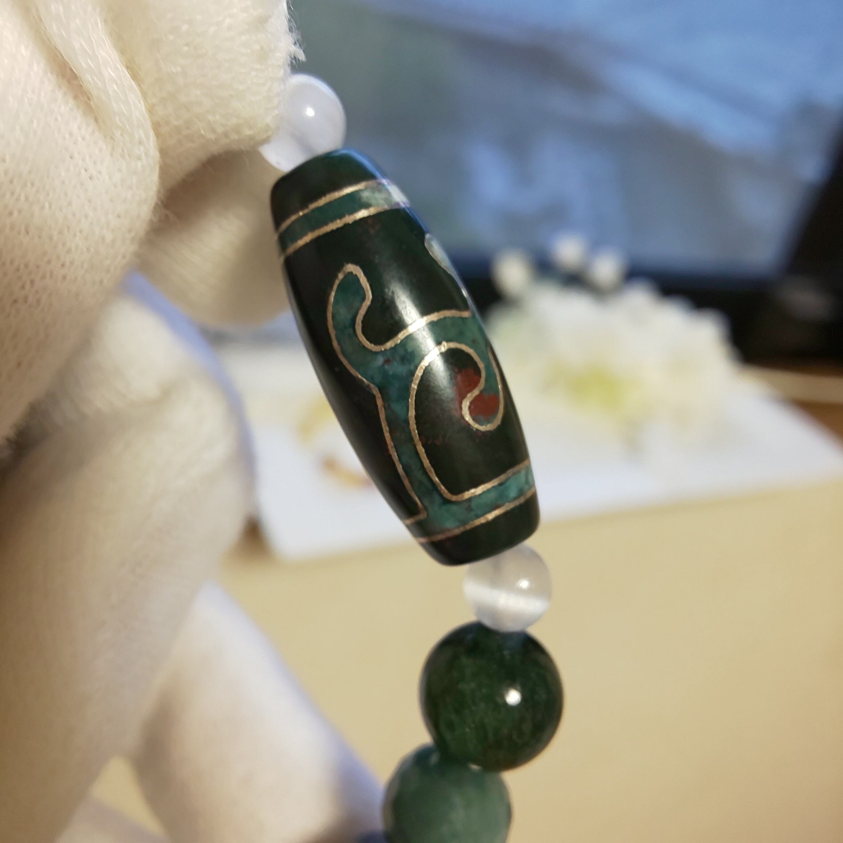 緑度母天珠をグリーンカラーのブレスに仕上げました♪