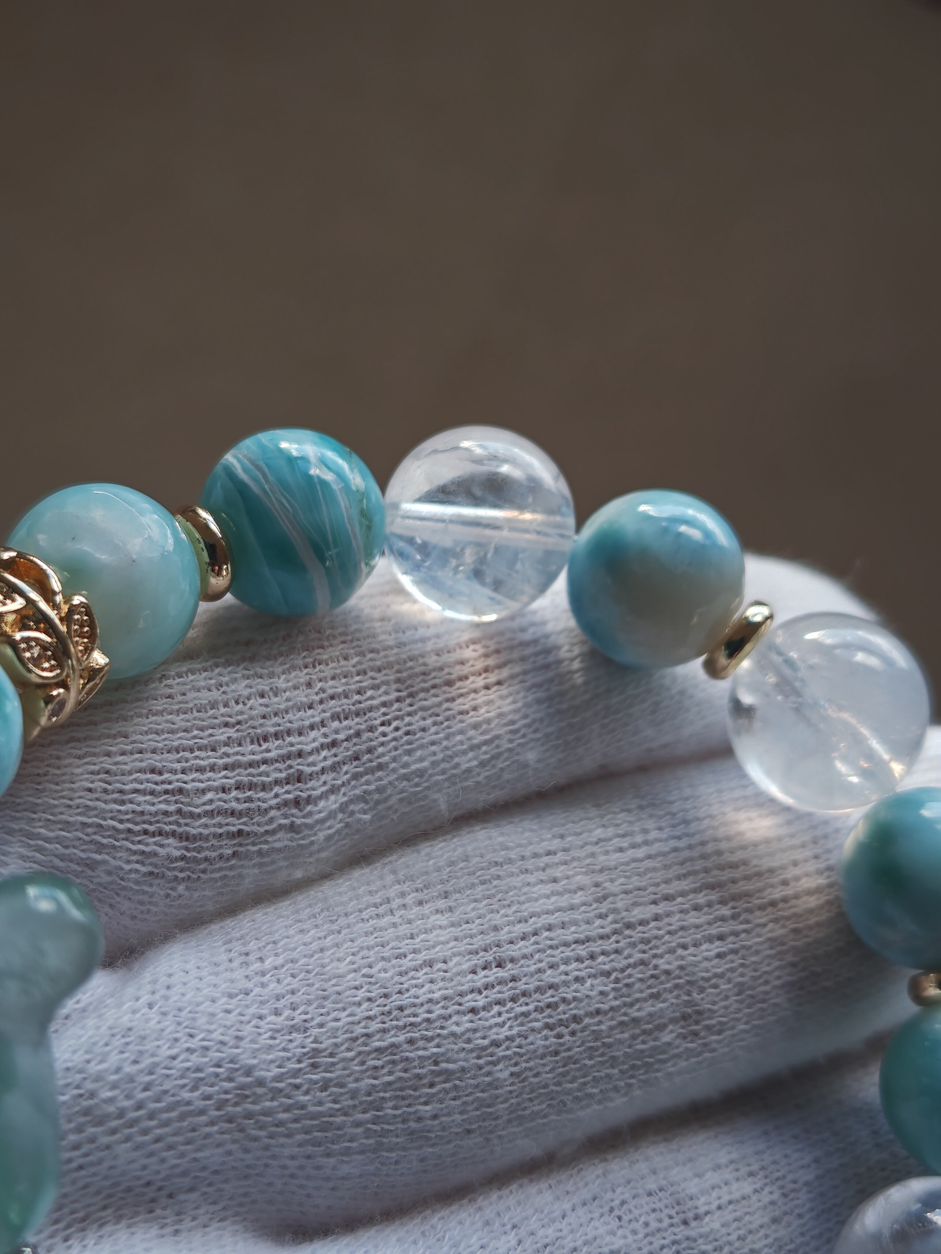 母岩がついたタイプの優しめで可愛らしいナチュラルラリマー、虹が綺麗なエンジェルラダークオーツで仕上げました♪