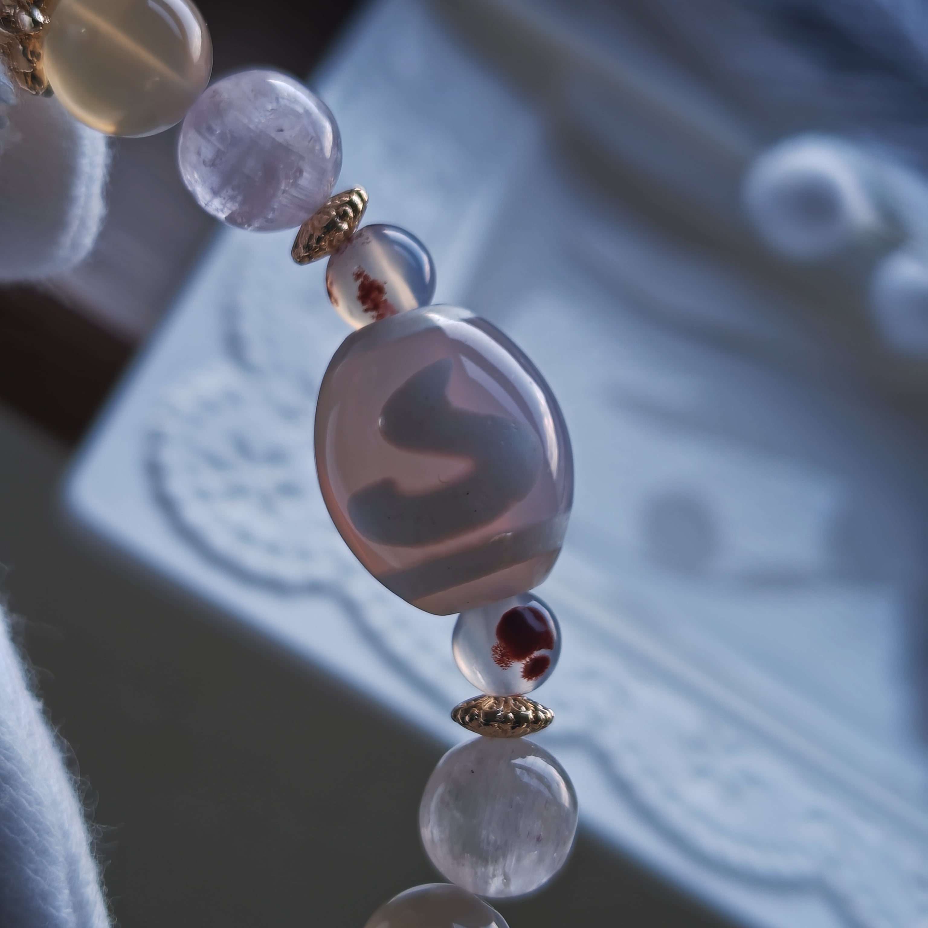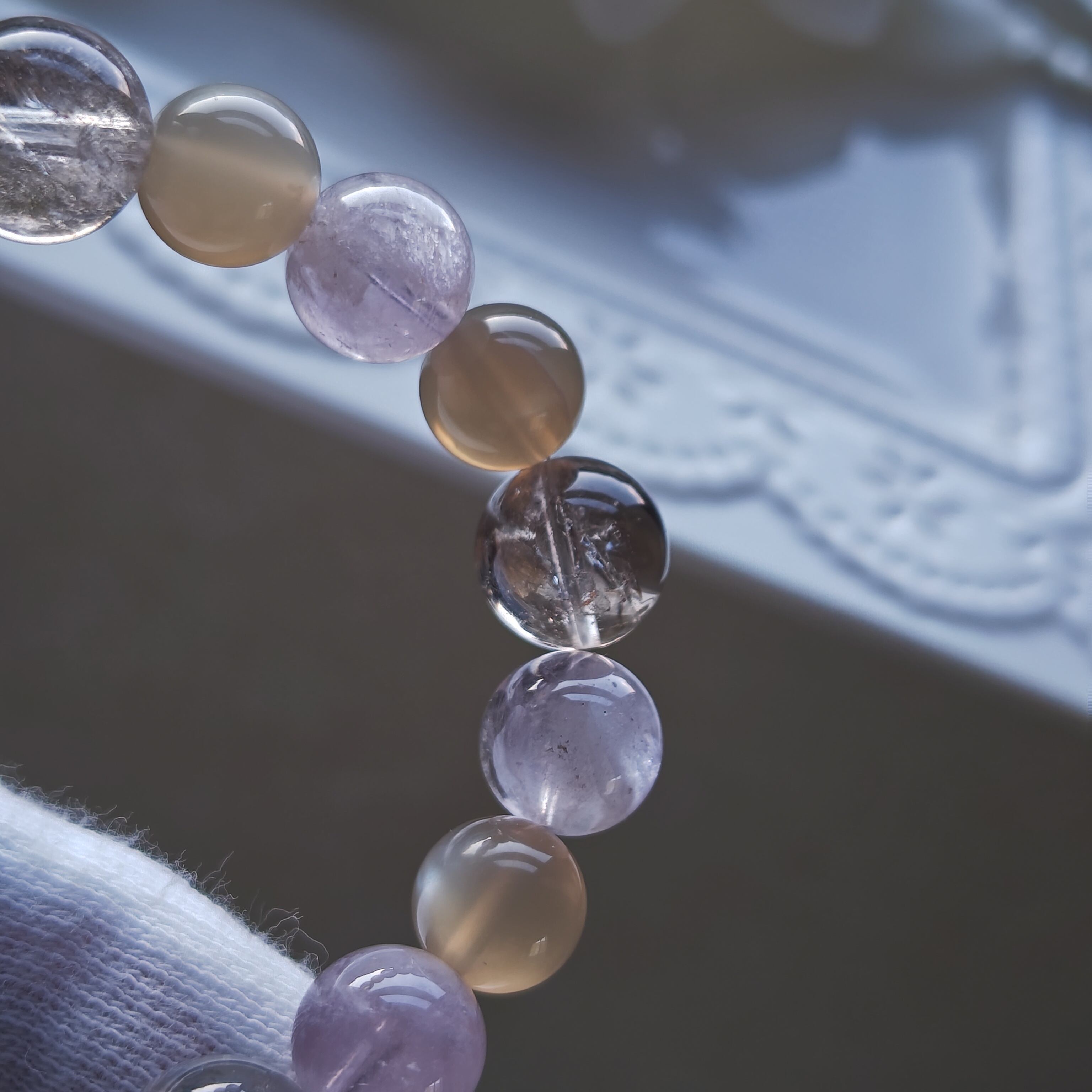 樽型のふんわりラベンダーの如意天珠とふわもこアメジスト、ヌーディブラウンのムーンストーン、アイリススモーキー、クンツァイトで母性愛溢れたブレスに仕上げました♪