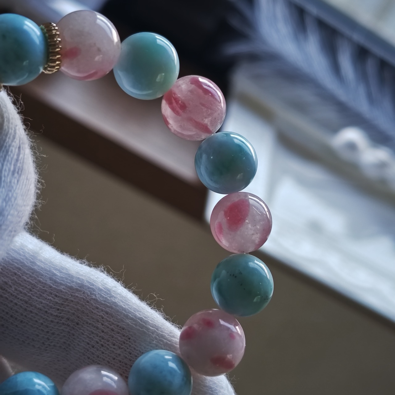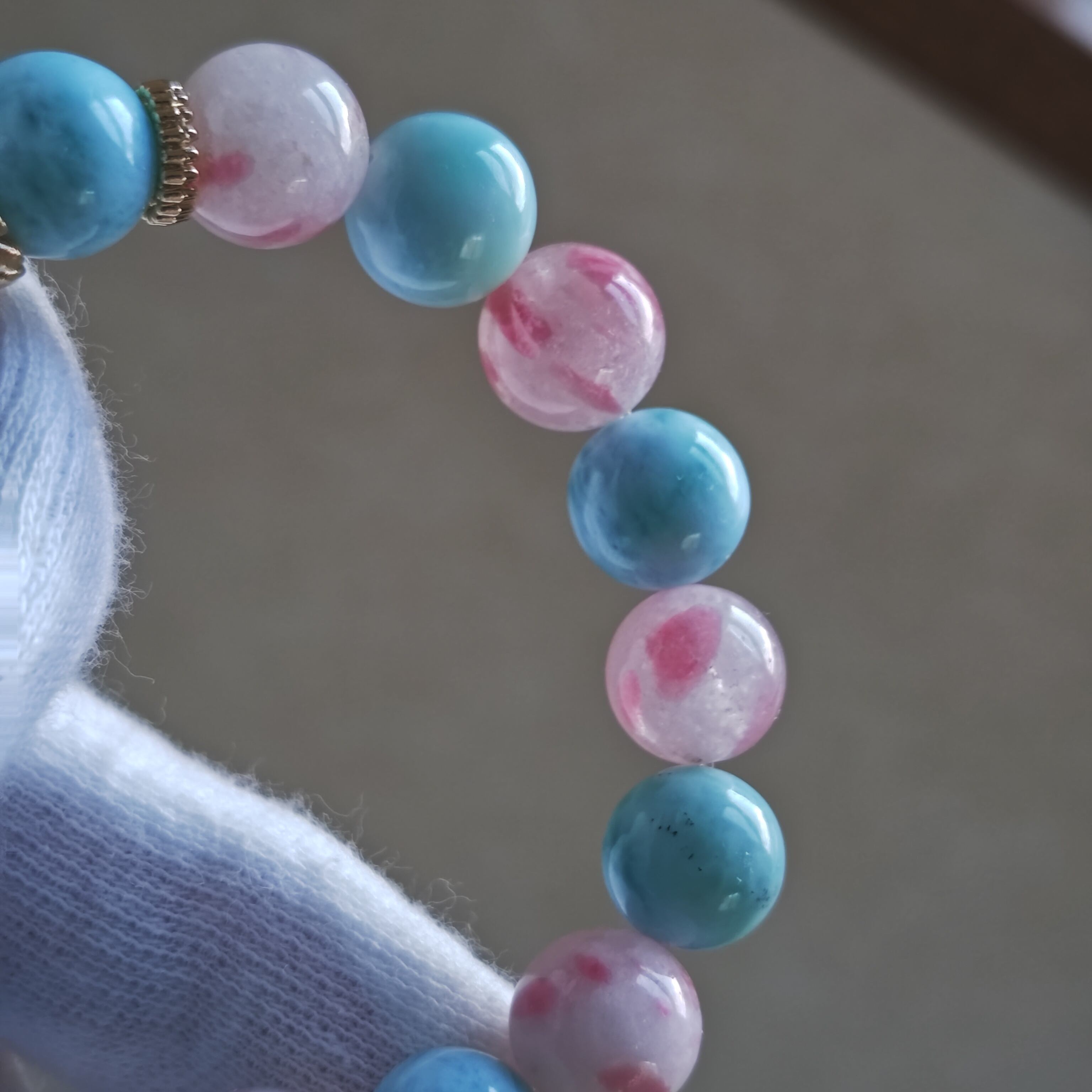 ナチュラルですが、世界三大ヒーリングストーンと云われているラリマーとロードナイトシリカでこちらもまた優しさ溢れるブレスに仕上げました♪
