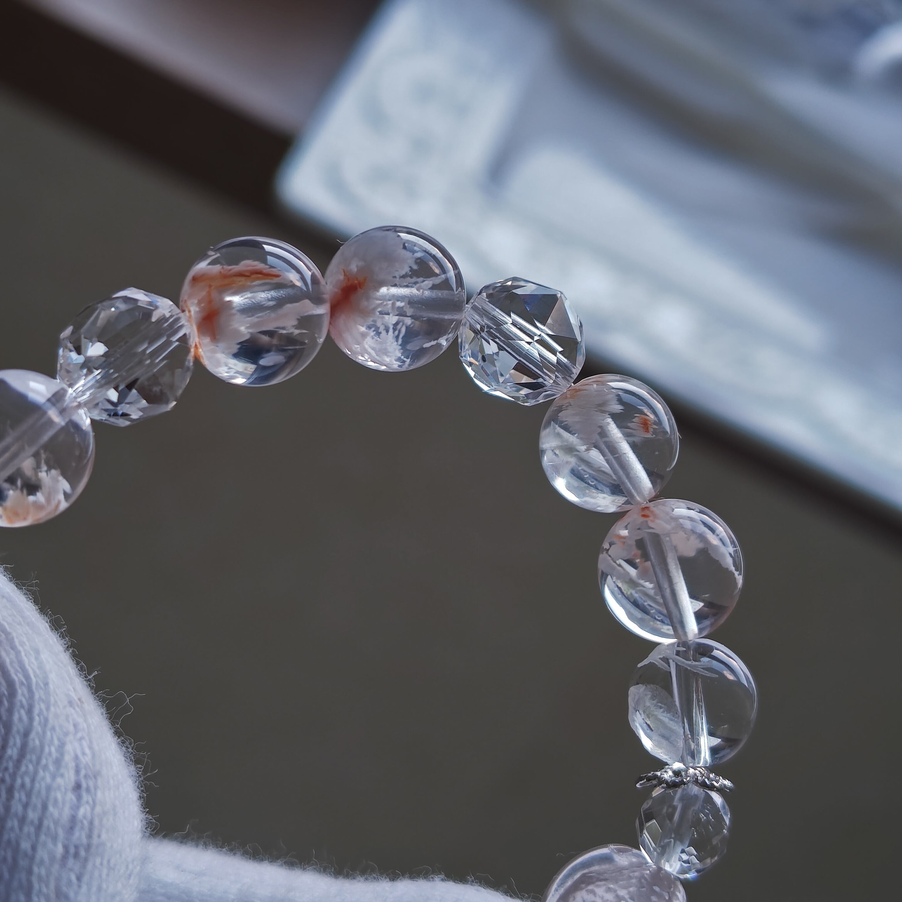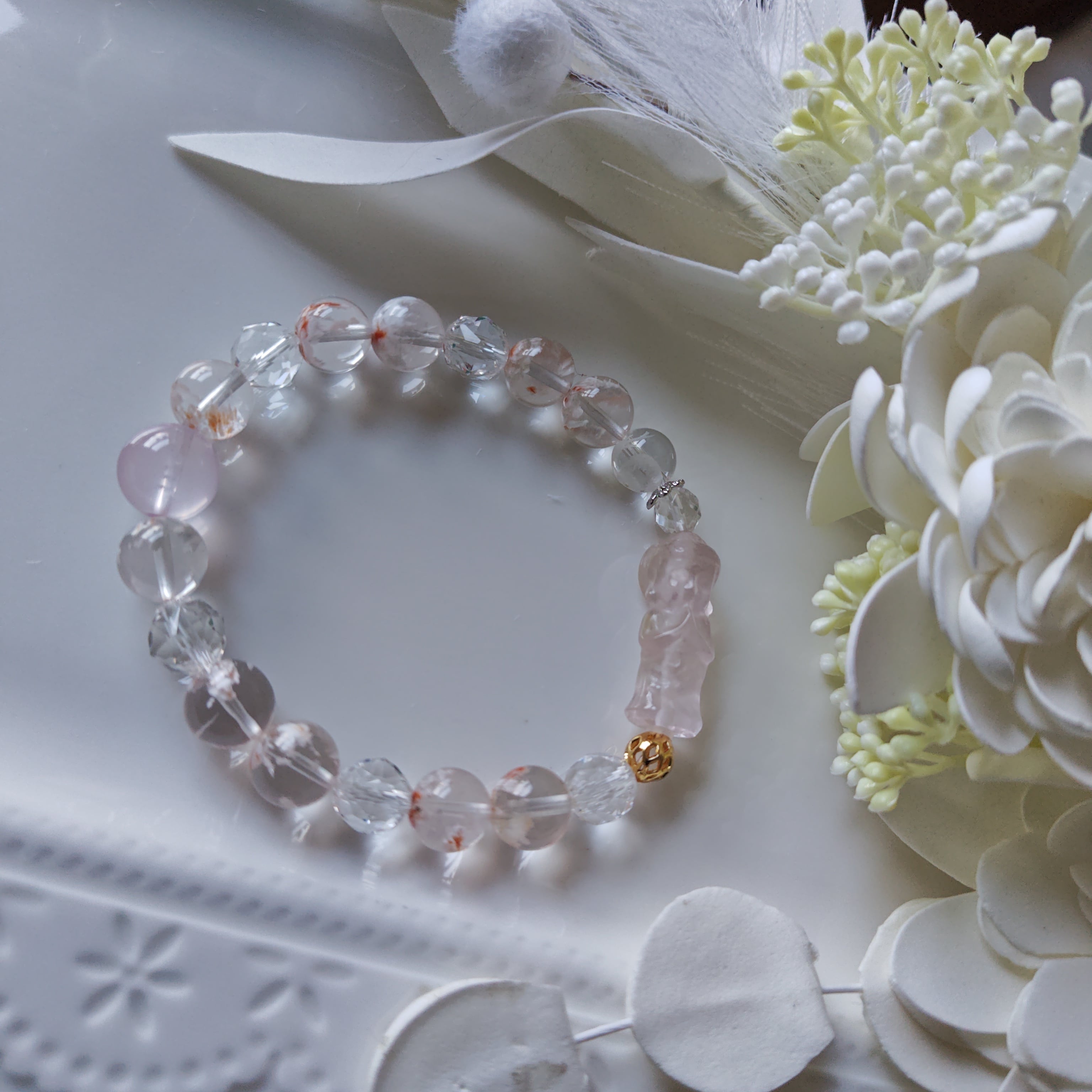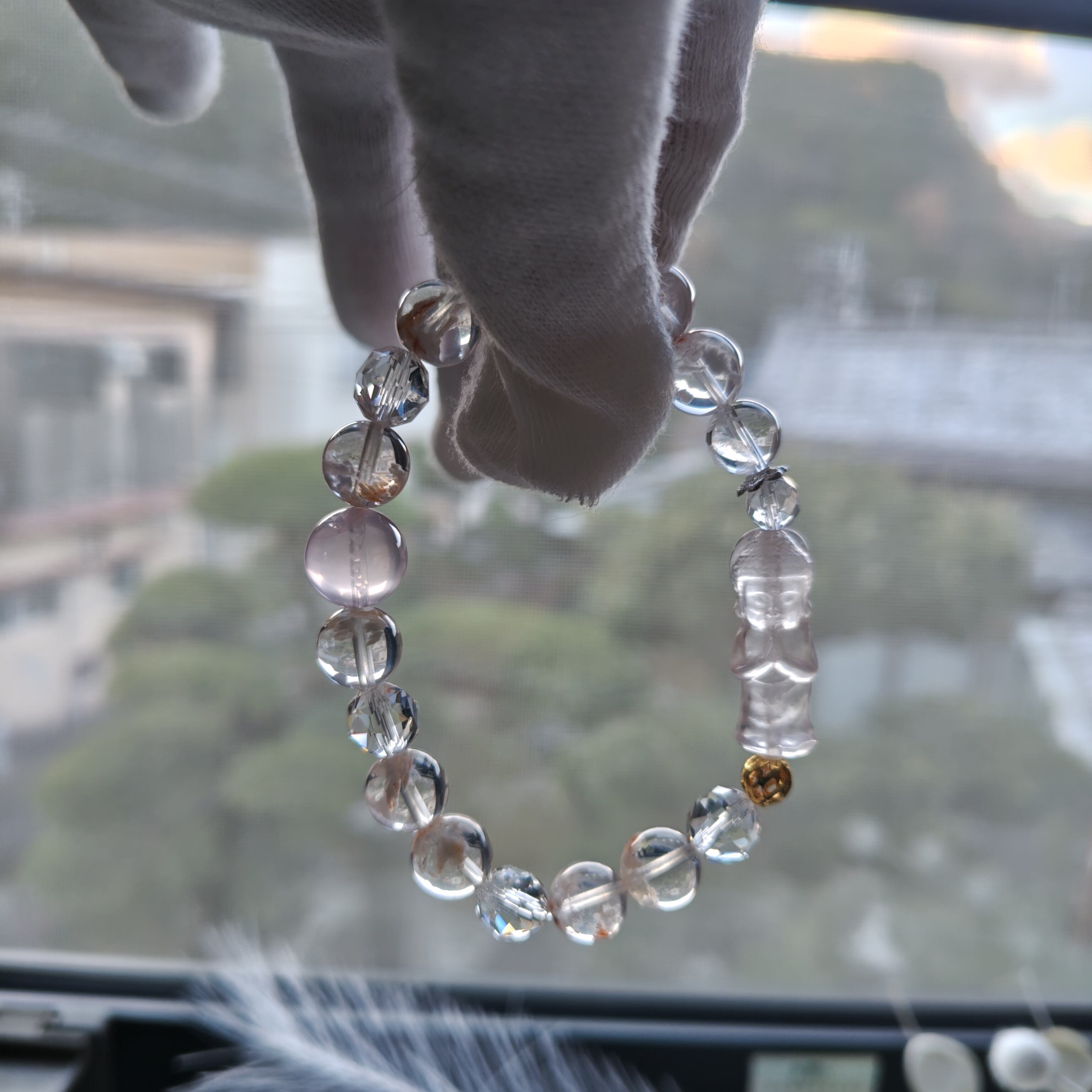こちらは組み直し子になりますがローズクオーツの大仏様とふんわりセリサイトインローズクオーツのブレスにプレミアムスターカットの水晶を合わせてキラキラ感を出しました♡