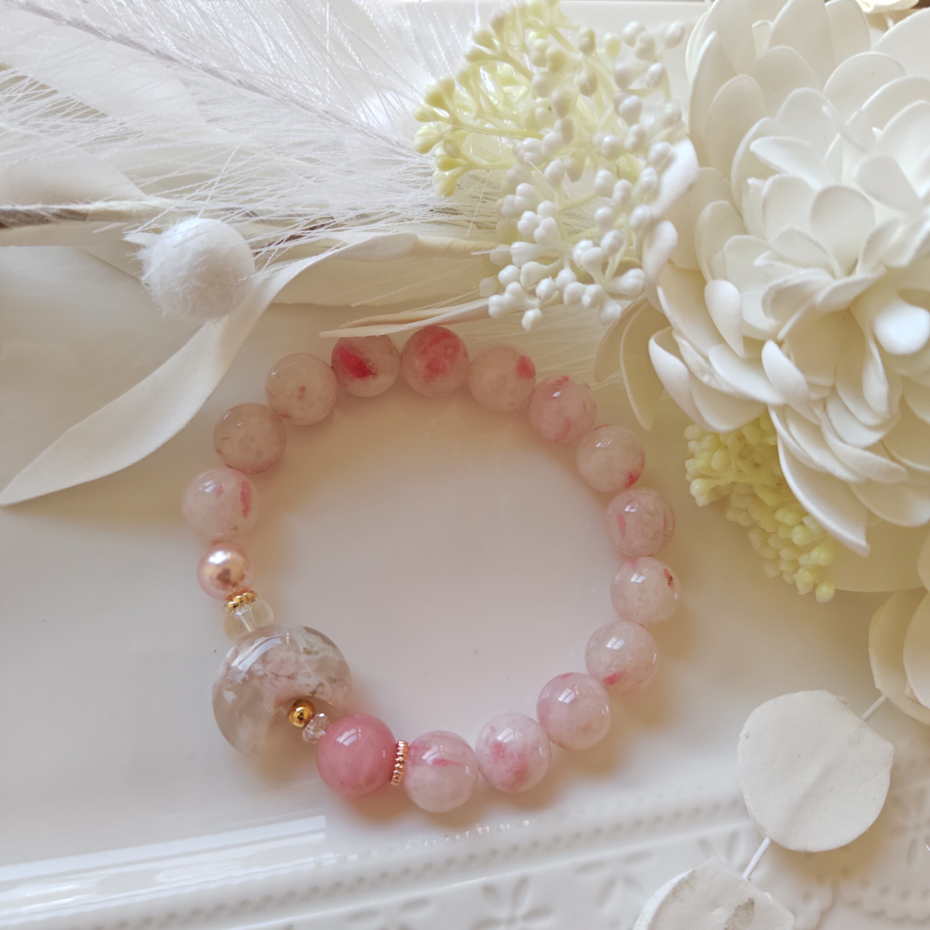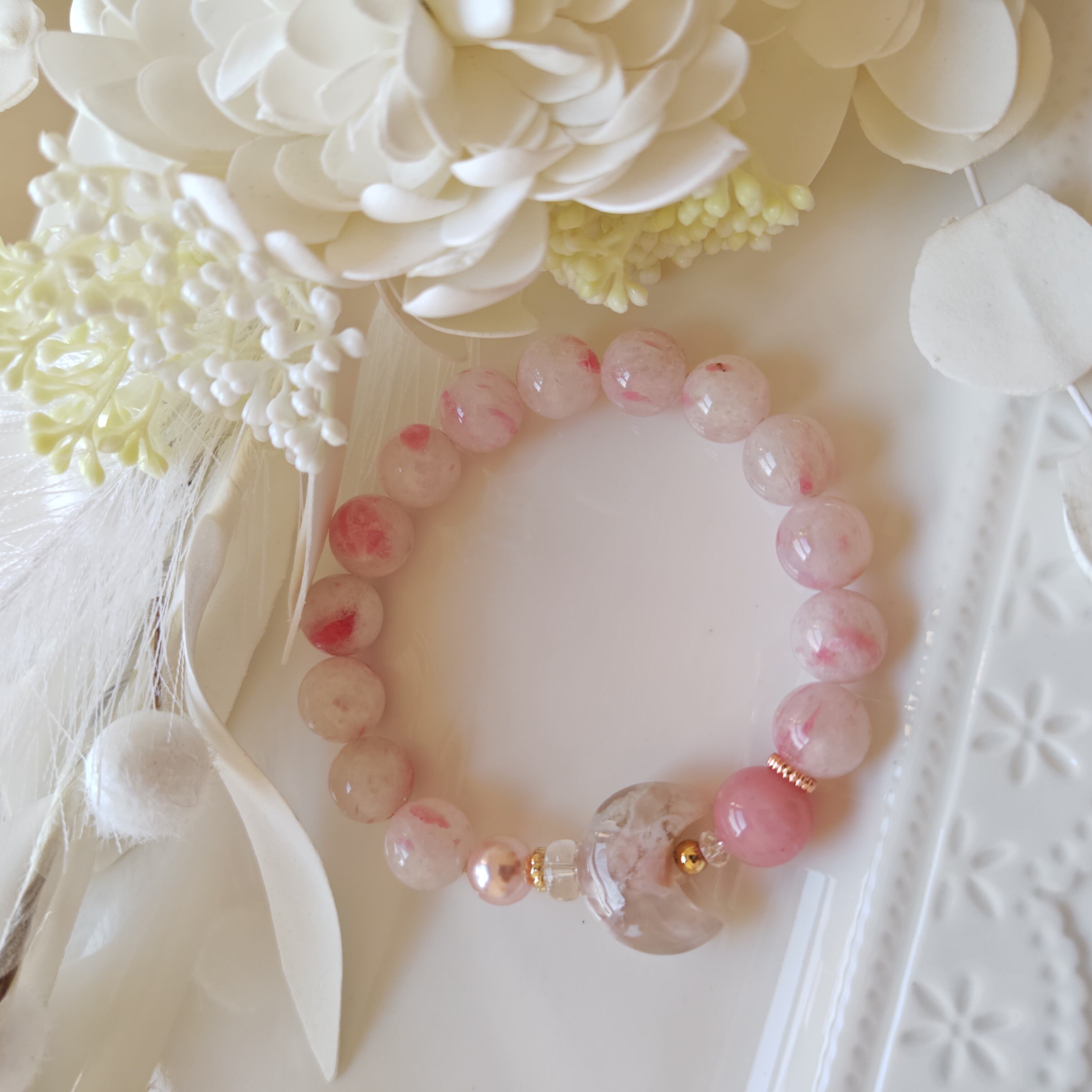 今回は可愛らしいロードナイトシリカに高品質なグァバクオーツと桜瑪瑙のお月様で可愛らしさの中に大人っぽさを表現してみました♪