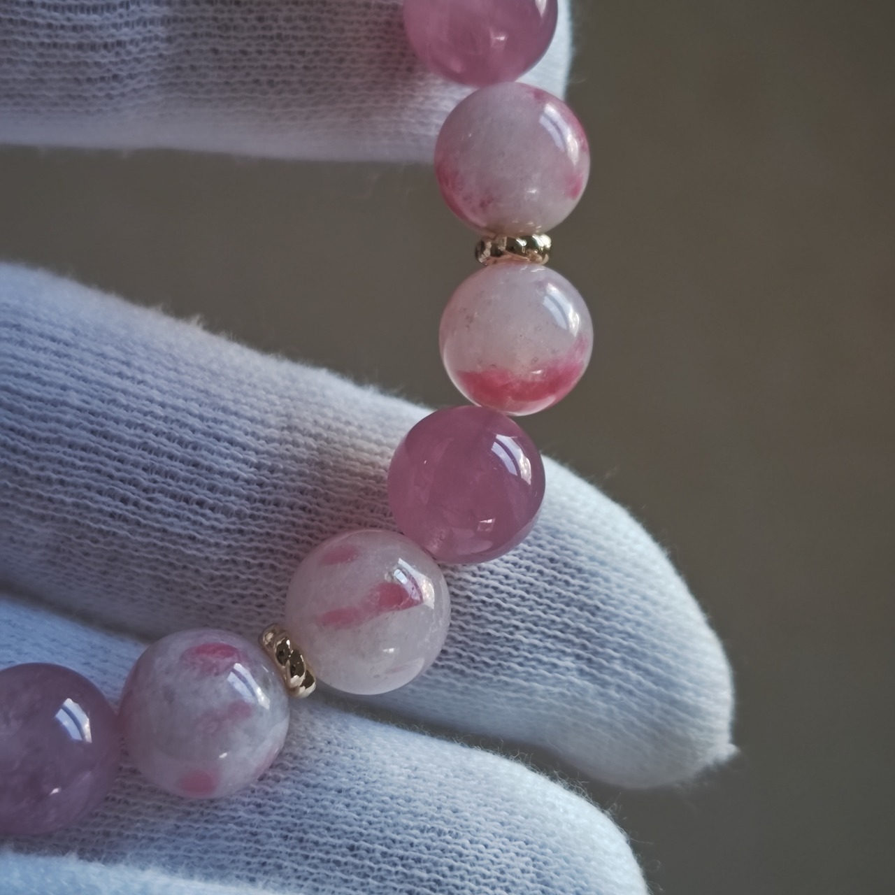 ロードナイトシリカは、ピンク色のロードナイトと透明な水晶が混ざり合った天然石で、「優しい愛のエネルギー」や「友愛」「家族愛」の象徴とされています。また、ストレスや疲労の緩和、心を開く効果、友人や恋人との関係を円満にする効果などがあるとされています。